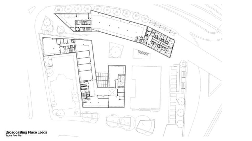 ブロードキャスティング・プレイスは、リーズ・メトロポリタン大学とダウニング・プロパティ・グループの複合施設である。 約10,200平方メートルのオフィスと教育スペースがあり、タワー棟には240戸の学生寮がある。