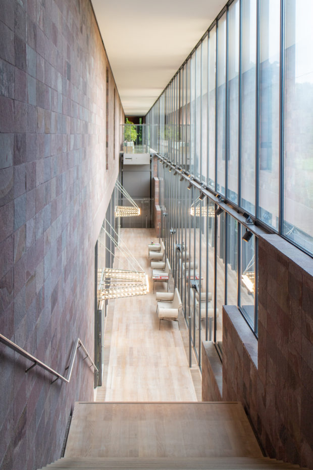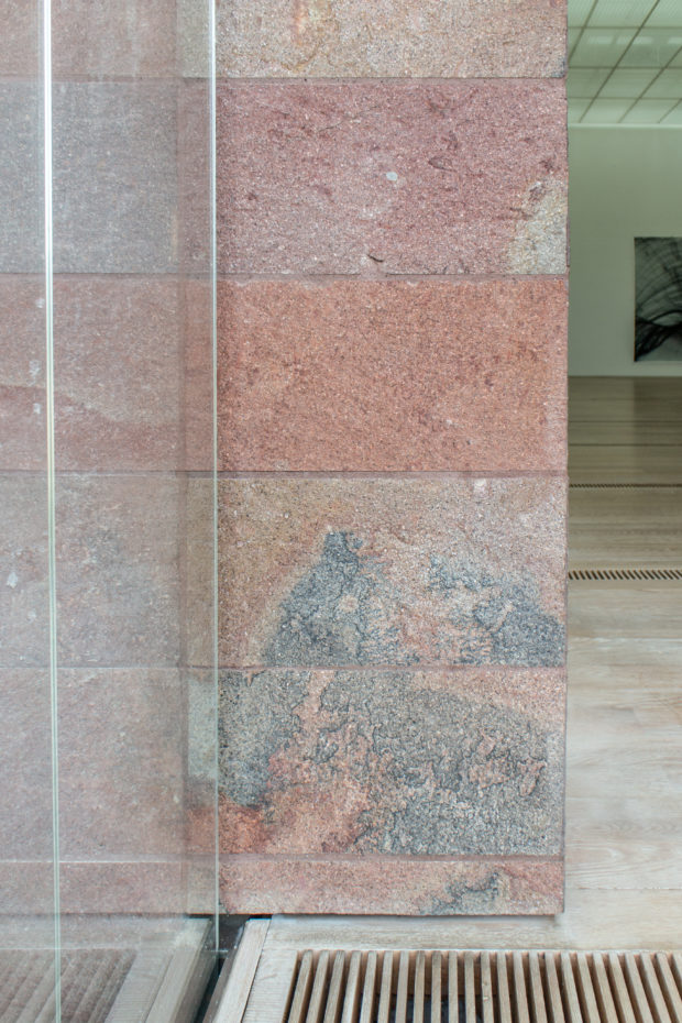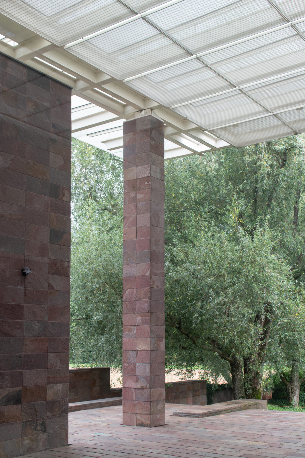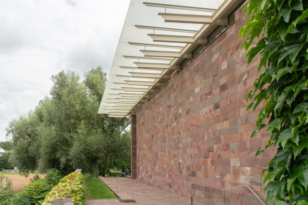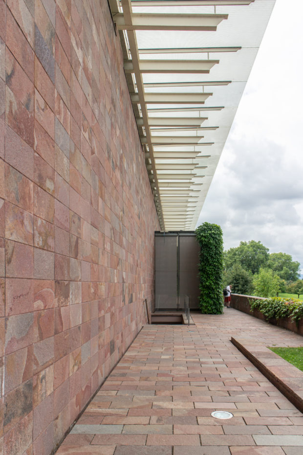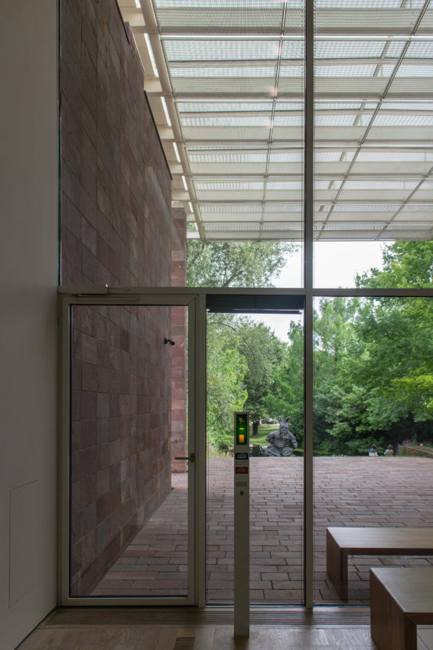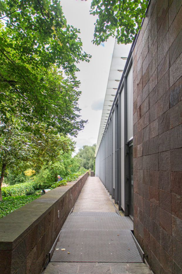 コレクションをワンフロアで利用できるようにし、建物南側の正面に池を作りたかったため、建物全体を地中に沈めなければならなかった。 これにより、建物と景観の調和がとれただけでなく、美術館がより親しみやすいものになった。 パタゴニア産の火山岩(ポルフィリー)を使用することで、壁が風景に溶け込み、あたかも建物が昔からそこにあったかのように見える。