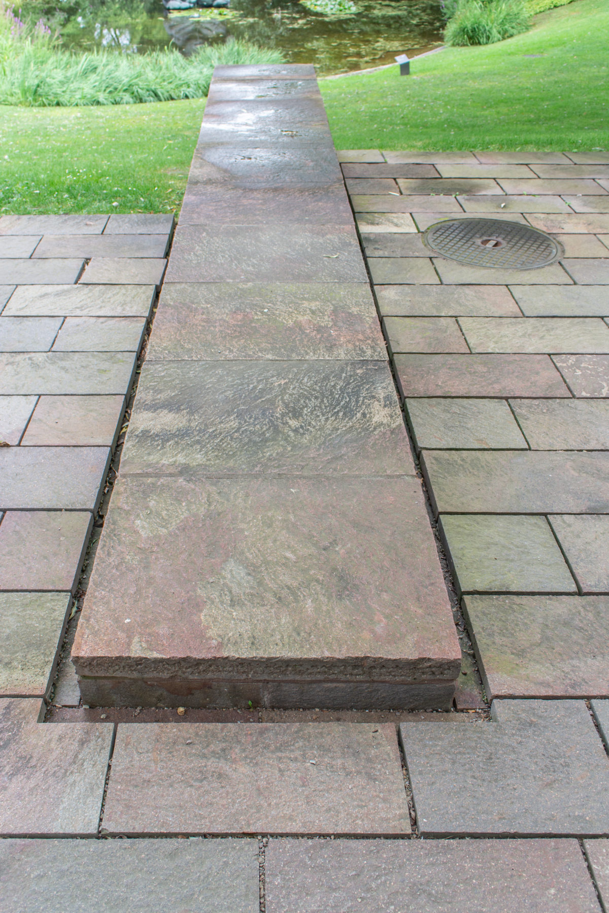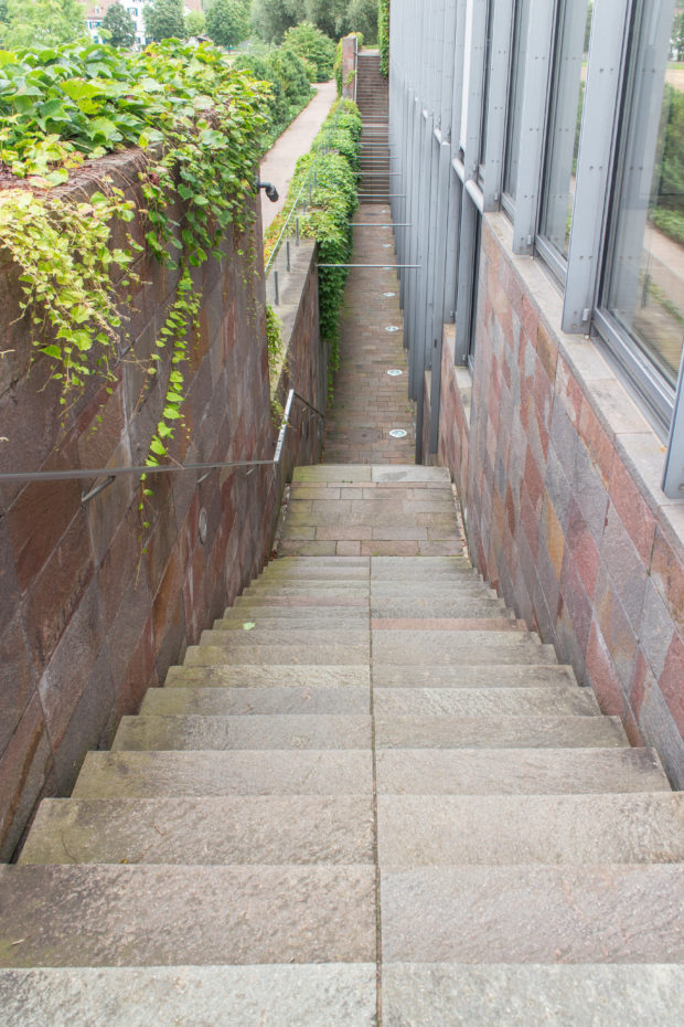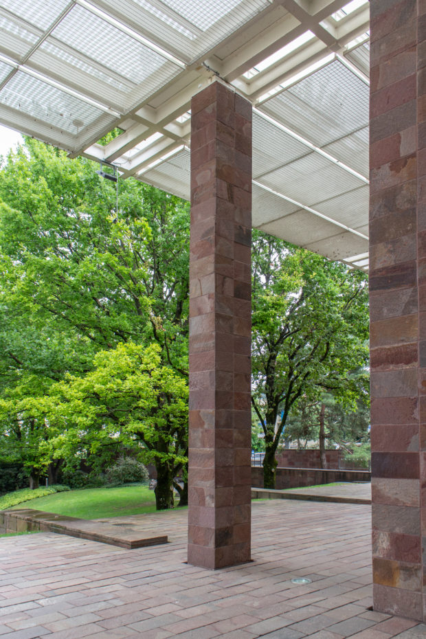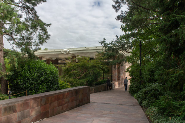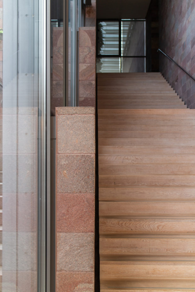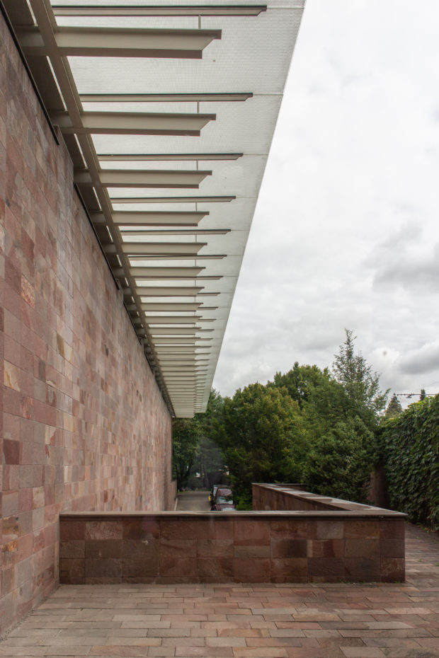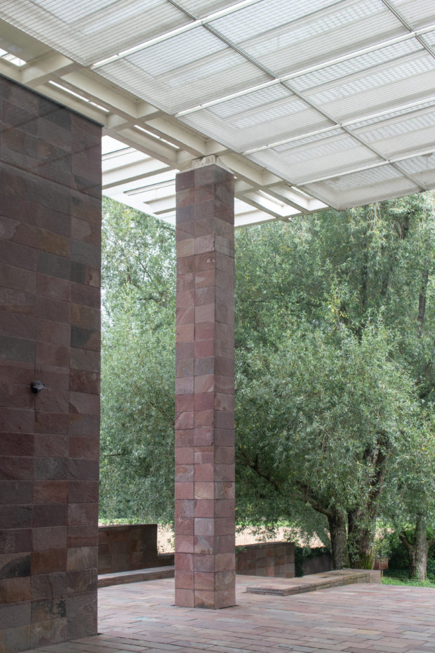 コレクションをワンフロアで利用できるようにし、建物南側の正面に池を作りたかったため、建物全体を地中に沈めなければならなかった。 これにより、建物と景観の調和がとれただけでなく、美術館がより親しみやすいものになった。 パタゴニア産の火山岩(ポルフィリー)を使用することで、壁が風景に溶け込み、あたかも建物が昔からそこにあったかのように見える。