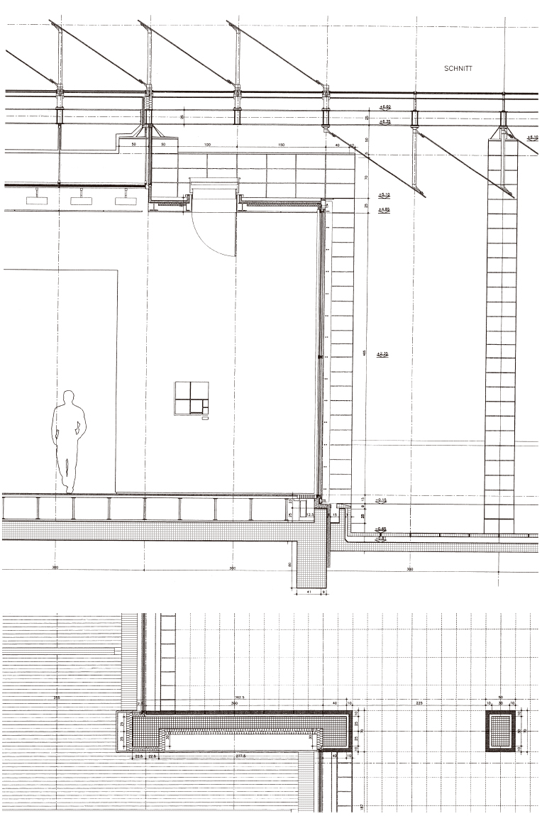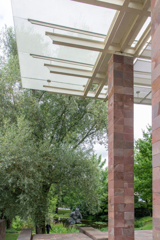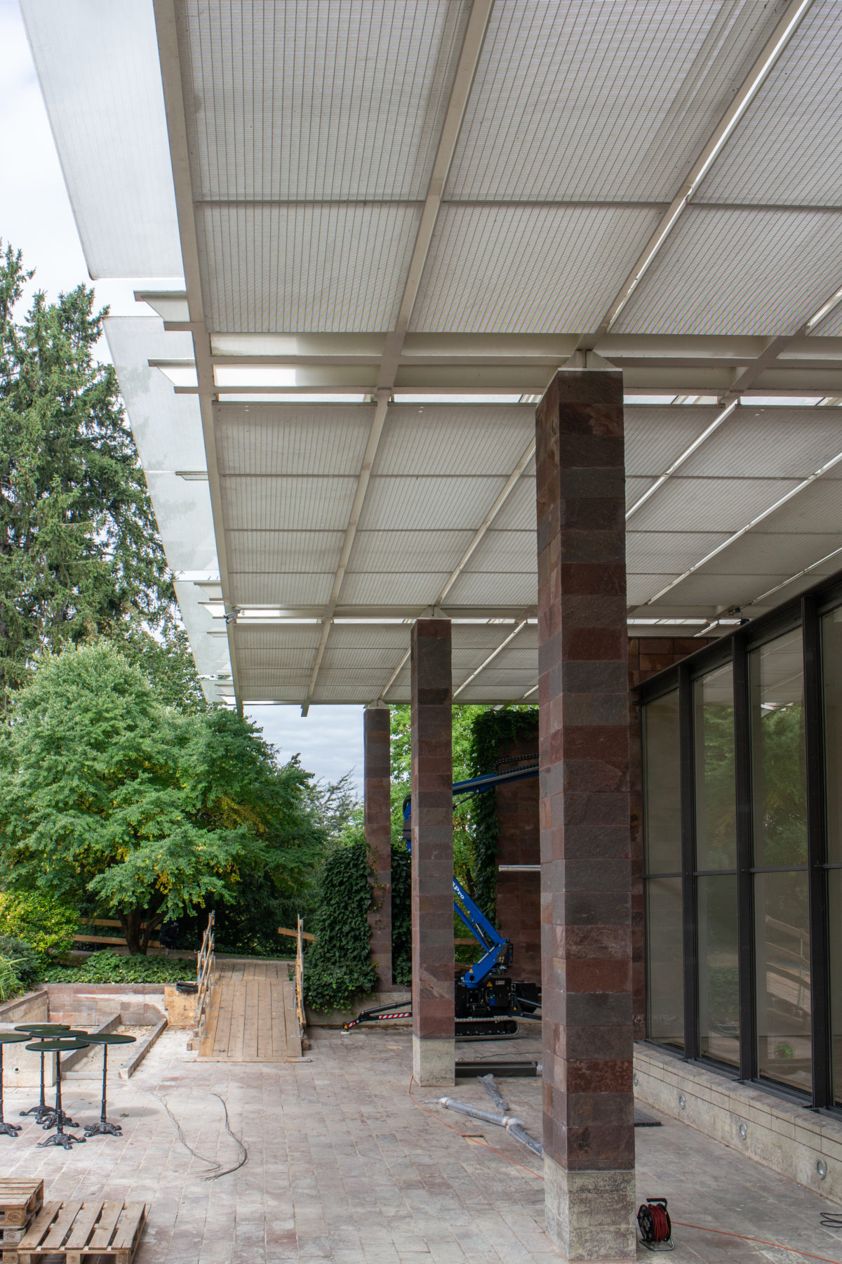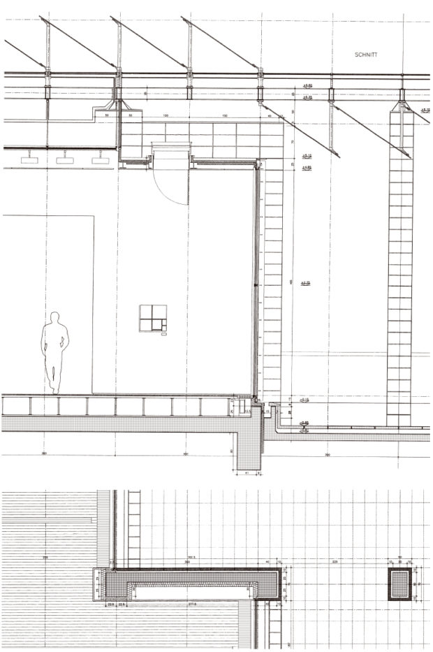 建物の北端と南端にある平らな屋根の張り出しは、石で覆われた鉄骨の柱で支えられている。南端では床スラブが伸びて睡蓮の池を形成し、風景の中に広がっている。 鋼鉄製の屋根構造は、ガラス屋根や内部ルーバー、二重ガラス、ガラス遮光パネルを支える支柱など、屋根のさまざまな層を連続的に支えている。