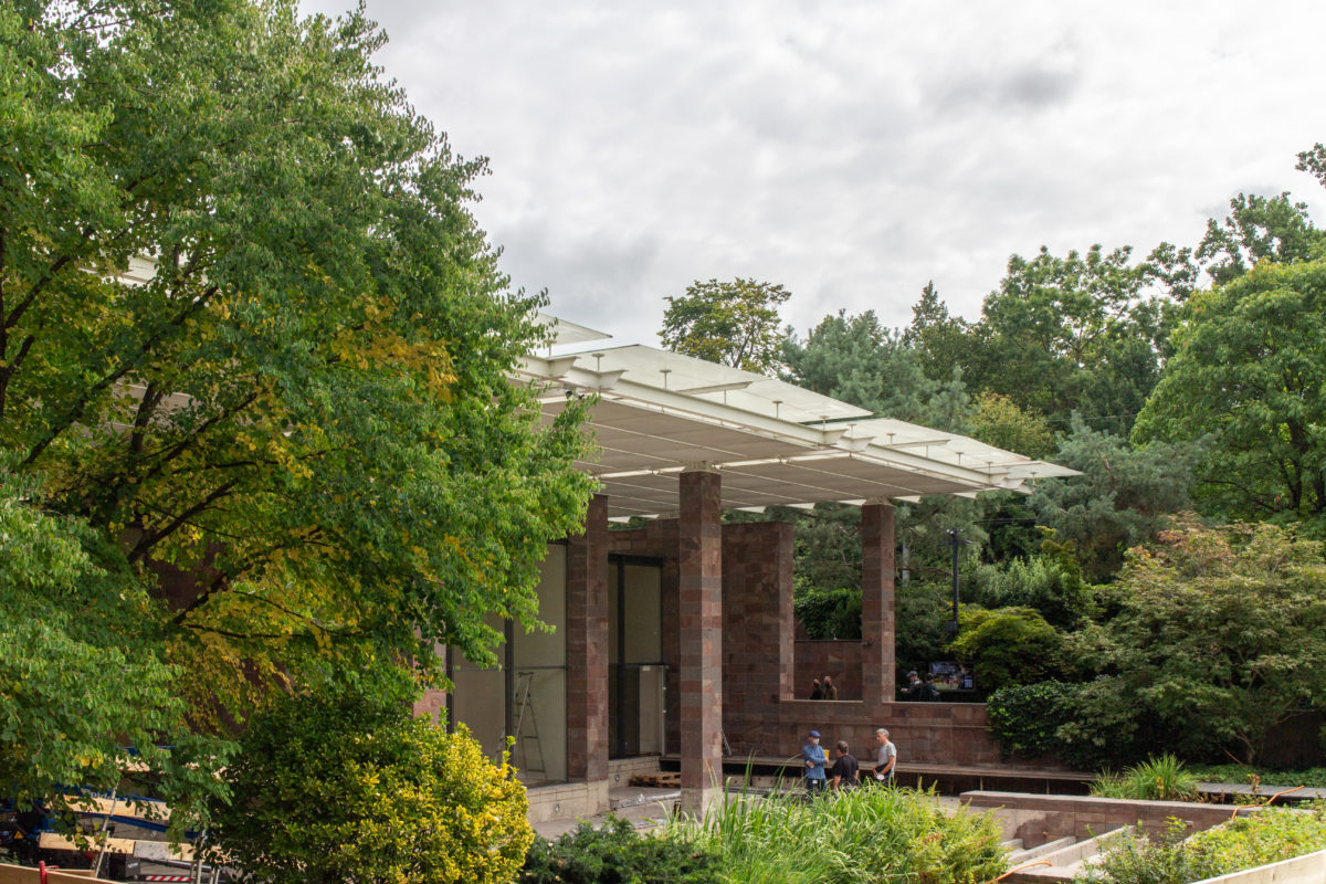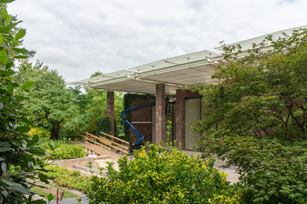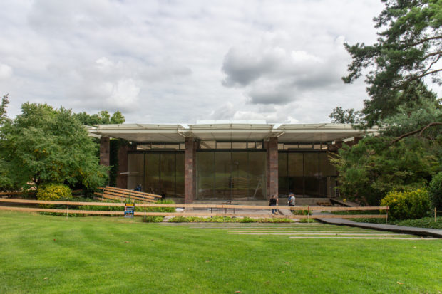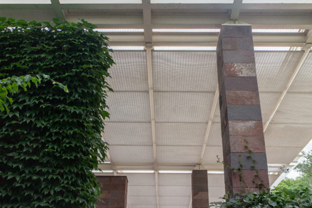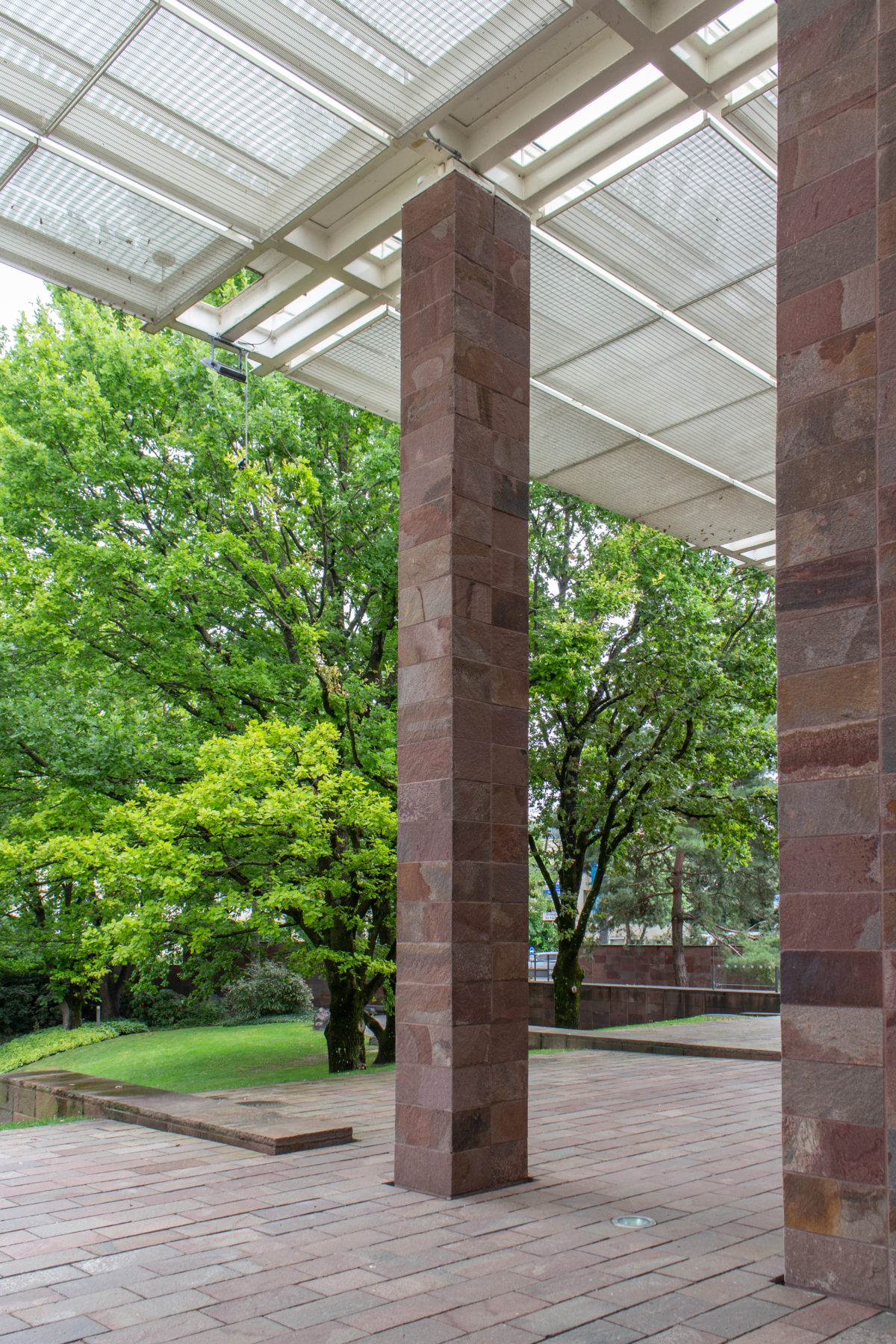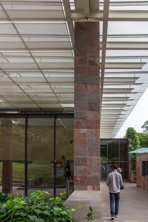 建物の北端と南端にある平らな屋根の張り出しは、石で覆われた鉄骨の柱で支えられている。南端では床スラブが伸びて睡蓮の池を形成し、風景の中に広がっている。 鋼鉄製の屋根構造は、ガラス屋根や内部ルーバー、二重ガラス、ガラス遮光パネルを支える支柱など、屋根のさまざまな層を連続的に支えている。