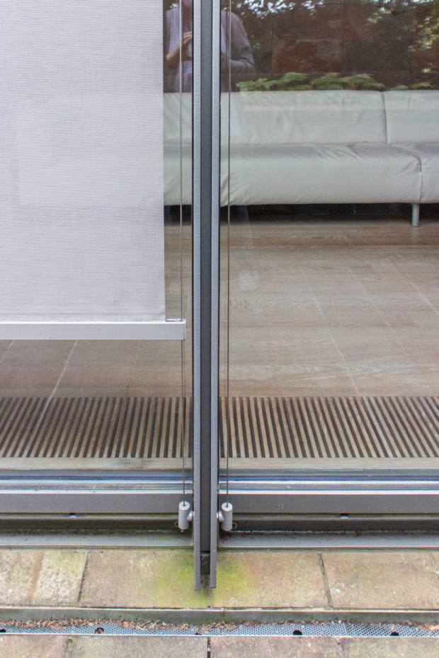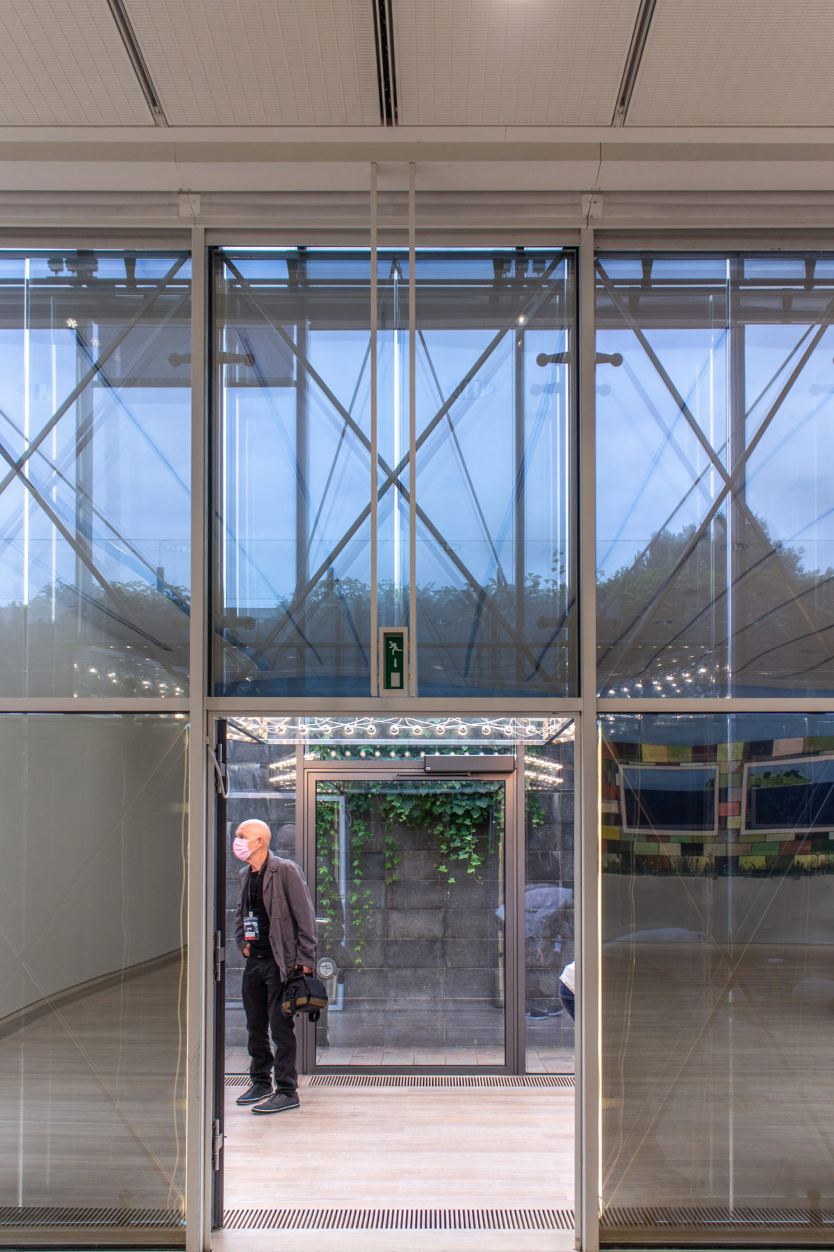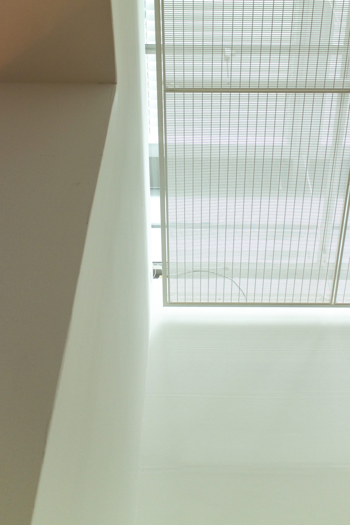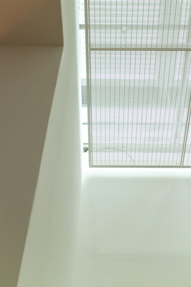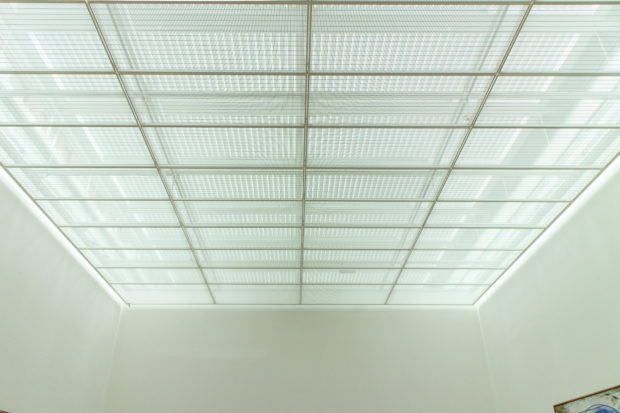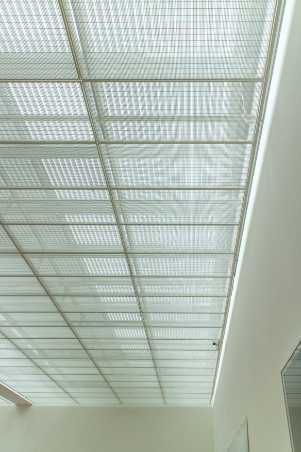 透明な屋根の下、1.4メートルには2層目のガラスがあり、外気温の変化に対抗し、メンテナンスを容易にするための空気室となっている。 調整可能なルーバーはこのチャンバー内にあり、外が暗いときに直射光と人工照明を適度にカットする。 このベールの下には、穴のあいた板でできた箱があり、その中に白い布が敷き詰められている。