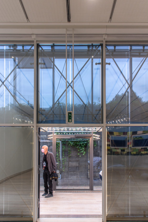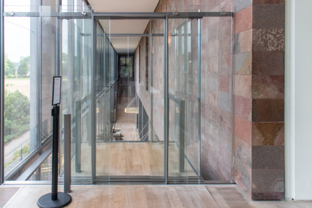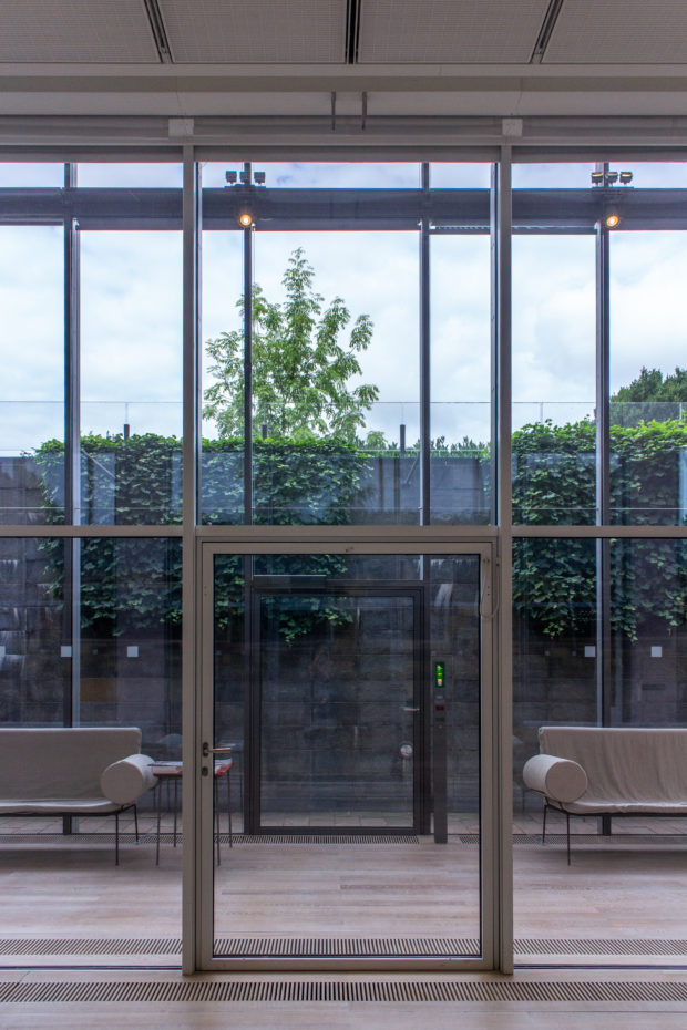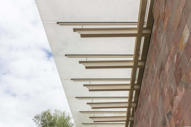 軽やかなガラスの屋根は石壁から大きく張り出し、ガラスのファサードを日差しから守っている。 曇りガラスのパネルは、室内に影が落ちるのを防ぐが、微妙な光の変化を可能にし、生き生きとした雰囲気を作り出す。