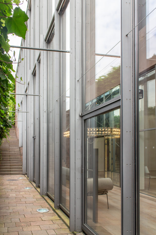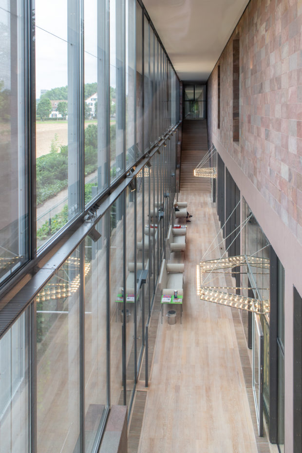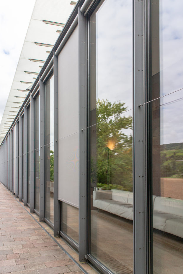 強固な基礎壁の上に、軽量ガラスでできた平らな屋根(4000m2)、裏側は白くガラス張りになっており、北からの光は取り込むが、東と西からの光はシャットアウトする。 北側と南側に沿って、屋根は壁から大きく張り出し、ガラス張りの部屋のファサードを日差しから遮り、憩いの場を作り出している。 建物はガラス張りの西側ファサードから、テューリンガー丘陵を覆うトウモロコシ畑とブドウの木々を眺めることができる。