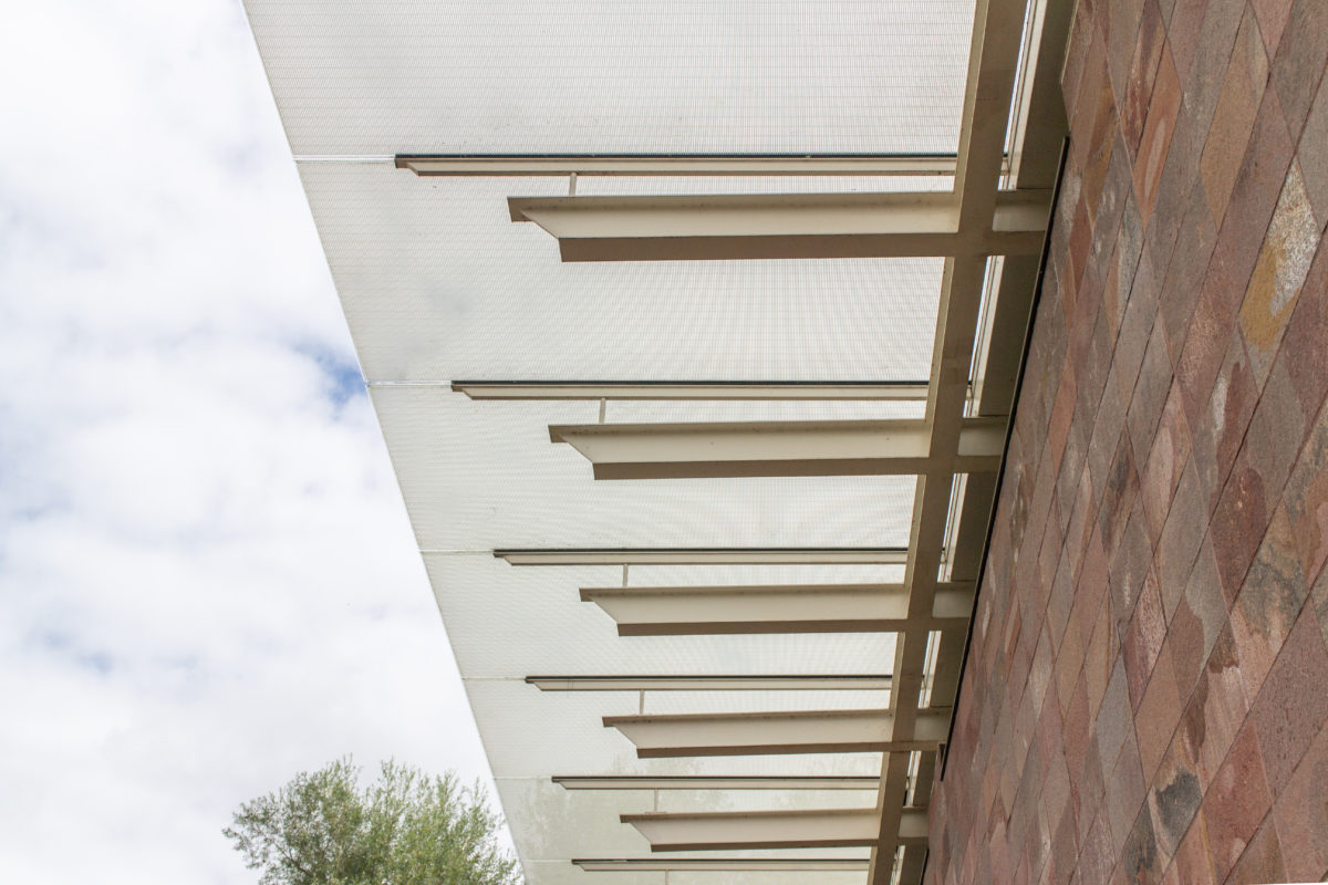南北方向の下側のルーバーは可動式で、構造用ガラスの層で保護されている。軸線に対して配置された上側のルーバーは、建物の特徴的なイメージを与える傾斜で固定されている。