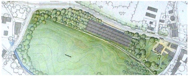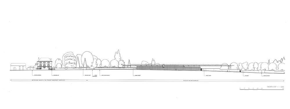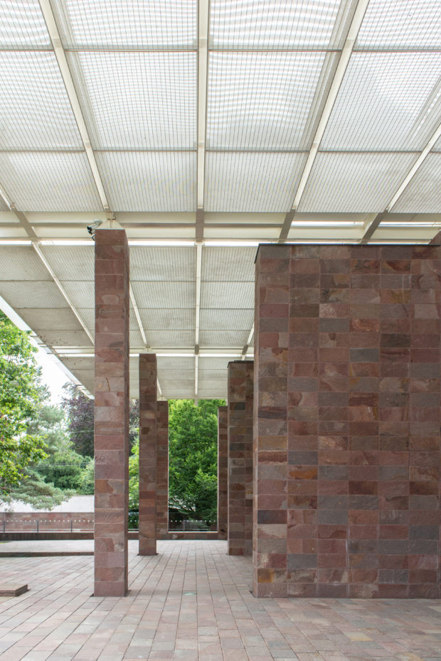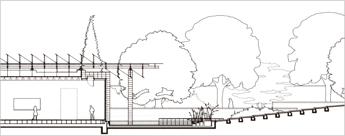 断面はよりダイナミックだ。 壁の高さはそれぞれ異なり、一番東の壁は公園内に伸びて、エントランスへと訪れる人々を導く建物の壁に似た低い壁になっている。