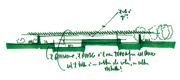 レンゾ・ピアノは計画当初から、建築と自然を融合させ、地形に合わせた3つの翼を持つ建物を提案した。 敷地内の庭を区切る2つの周壁は、美術館の設計にインスピレーションを与えた。