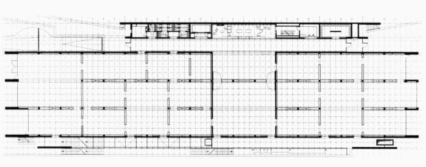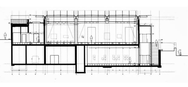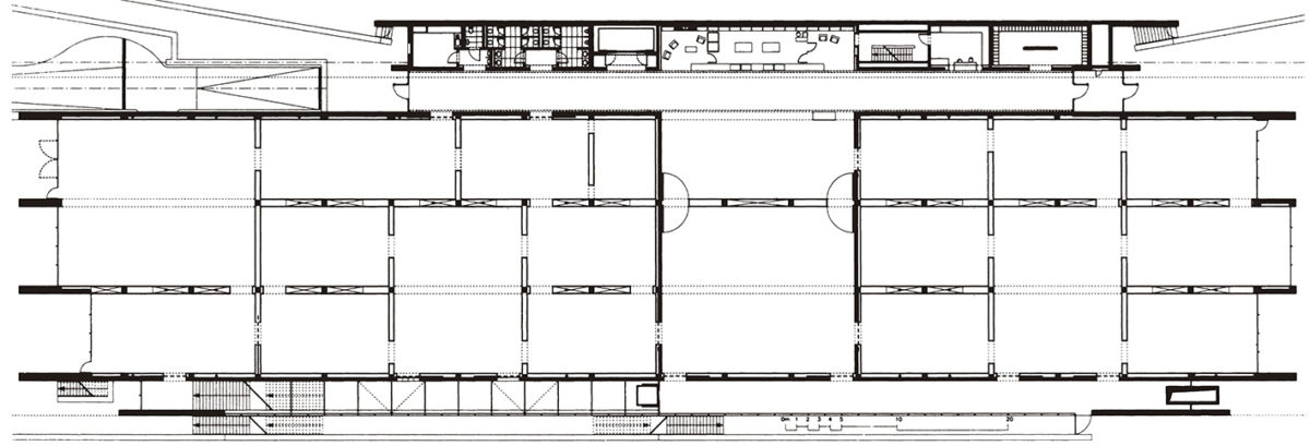 長さ127m、高さ4.8mの4つの支持壁が、南北方向に、互いに平行に、また区画を示す壁と平行に、7m間隔で伸びており、建物の平面図を定めている。 この壁は、コンクリート柱を格子状に組んだもので、外側は石板、内側は石膏ボードで覆われている。 平行六面体を囲む短い壁はガラス張りになっている。