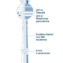 軸の頂点にある大きな球体には、展望台と200人収容のレストランがある。 内部は7階建てで、一部は一般公開され、残りはドイツのテレビ局が運営する40の施設に使われている。