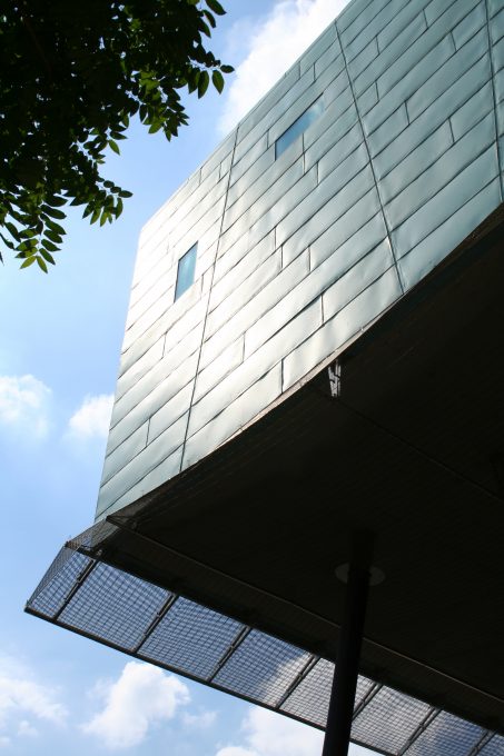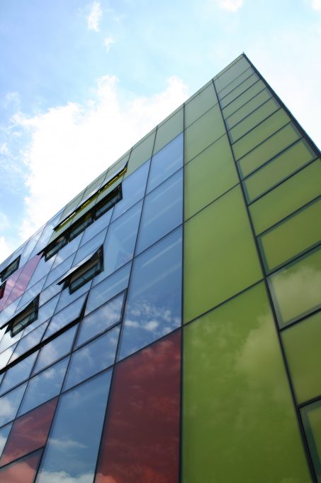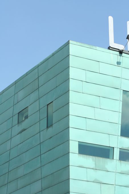 外壁材は、耐久性と表現力豊かなテクスチャーと色彩のために選ばれ、塗装済みの銅メッシュとスチールメッシュが、北側ファサードのカラーガラス、透明と明るい色のガラスパネルとコントラストをなしている。 これにより、図書館スペースでは、自然光とカラー偏光が見事に組み合わされている。 その緑色の色合いが、屋根から突き出たオレンジ色の舌を際立たせ、建物の最上階の一部を日陰にしている。 ファサードの縁を補強するためにスチールメッシュが使われている。