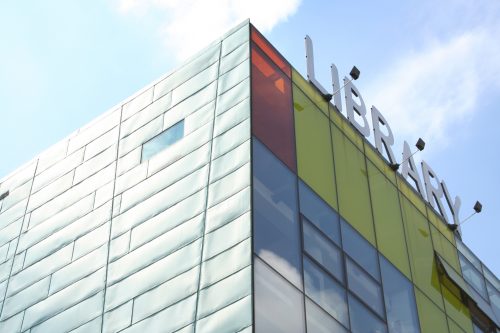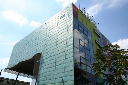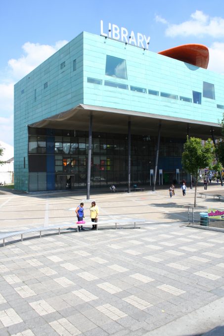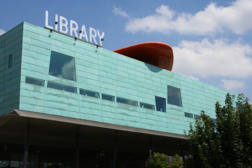 大きな黒文字でLIBRARY(図書館)と記されているが、これは単なる図書館ではない。 この建物は物理的な存在感があり、地域コミュニティにおける創造的で学習的な活動のダイナミックな拠点となっている。