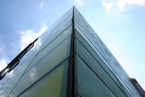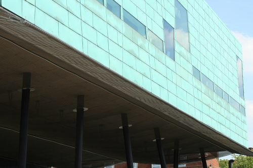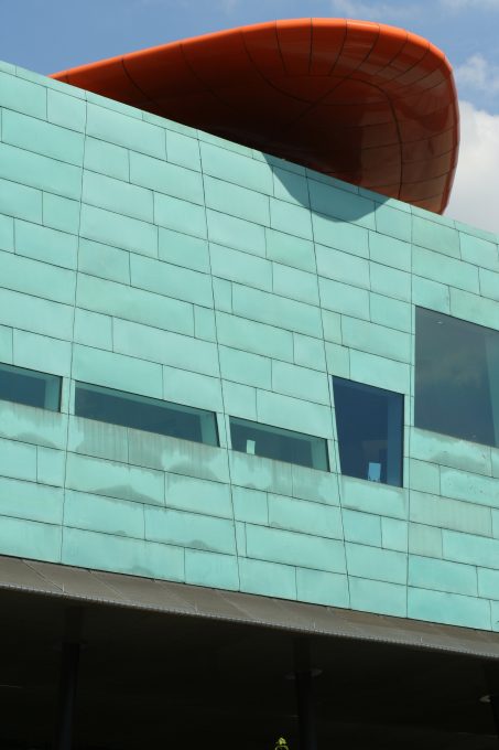 図書館の正面は構造用ガラス壁、背面はカラーガラス、その他のファサードは塗装とパテ処理が施された銅板で覆われている。