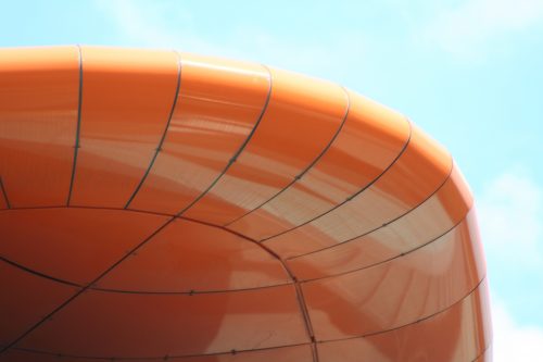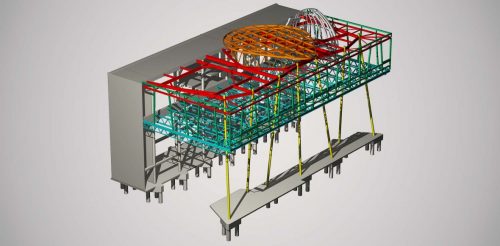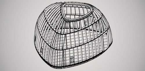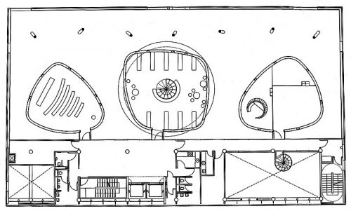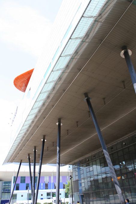 もう一方の端は、コンクリートを充填した7本の傾斜した鉄骨柱で支えられており、この柱はメインフロアのスラブと上部の屋根構造につながっている。 柱の角度を変えることで、建築家たちの遊び心を表現している。 柱の傾斜は、外側では建物の直交性を崩すのに役立ち、内側では3つの卵形ボディによって実現されている。