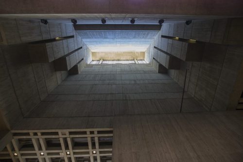 中央の大きな中庭は、建物の中心に光を取り込みながら、これらすべてのエリアを一体化し、つなげている。 セラミック舗装の大きな階段が、広場の空間を中庭へと広げている。 さらに、上階へと続く彫刻的なコンクリートの階段がある。