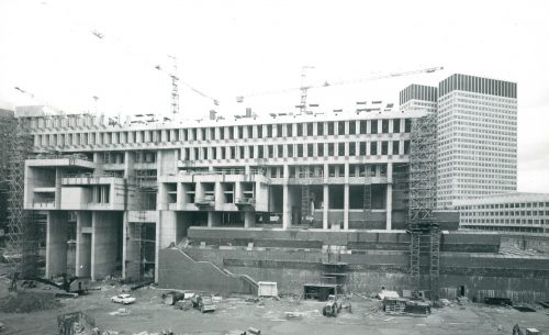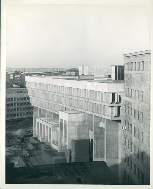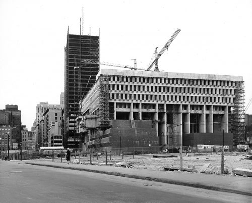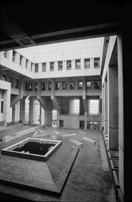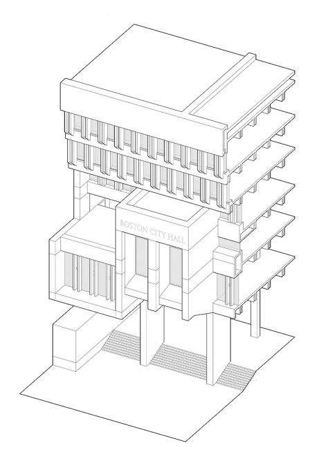 1962年、新ボストン市庁舎の設計コンペが開催された。 256の提案の中から、コロンビア大学教授のゲルハルト・カルマンとコロンビア大学大学院生のマイケル・マッキネルが提案したものが優勝した。 その後、2人はエドワード・ノウルズとともにカルマン、マッキネル&ノウルズ社を設立した。 そのデザインは、当時流行していたスチールやガラスの美学とは大きく異なっていた。 建築家たちは、建物の素材に焦点を当てた提案をする代わりに、住民との関係における建物の役割に焦点を当て、それをプロジェクトのさまざまな側面で表現することを選んだ。
