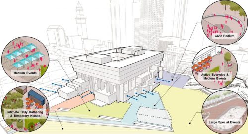 提案は広場の空間を考慮し、舗装の連続性によって広場を建物の1階の一部とした。 このような空間の関係は、毎日通勤でこの広場を通る市民と政府とのつながりを作ろうという発想から生まれた。
