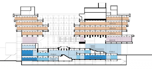 同様に、建物のデザインは、役所の公共的または私的な機能に直接関連して、空間のグラデーションを提案した。 住民は、市民相談コーナーにアクセスすることで物理的に、あるいは市役所の通常の業務に立ち入ることができることで視覚的に、建物の内部空間を支配することができる。 官僚的な機能が強まるにつれて、スペースは建物の上層部に配置されるようになり、この制度的な硬直性が建物の外観に現れるようになる。