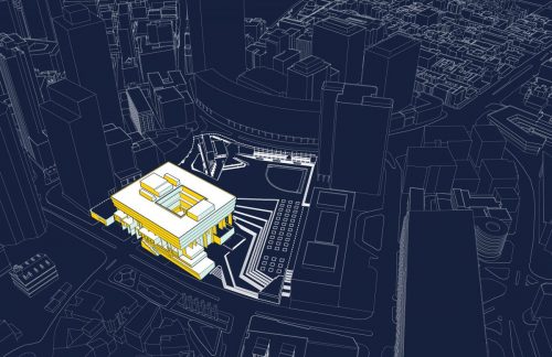 この広場は1968年にI.M.ペイが設計したもので、市議会の建築家たちが提案に取り入れている。 新しい広場を作る過程で、政府によって策定された壮大なマスタープランに基づき、この大きな空間を作り出し、市街地を活性化させるために、いくつかの建物が取り壊され、道路が取り除かれた。 したがって、市議会のプロジェクトは、新しく、広く、遮るもののない敷地に基づくものであり、立地の最大の特徴は、隣接する道路との高低差である。