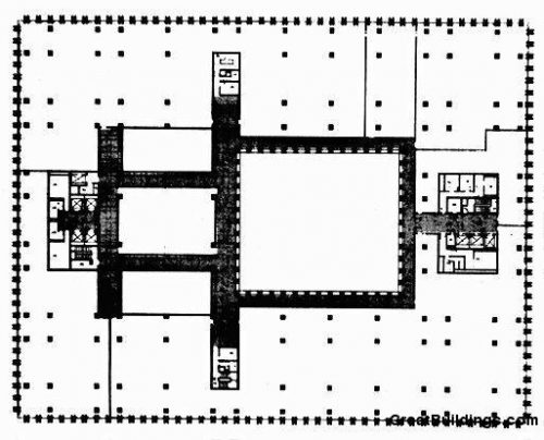 建物のファサードは内部の部屋を反映している。 接客エリアは低層階にあり、オフィスは高層階にある。 この機能の変化は、ファサードとヴォリュメトリーの外観に反映され、下層ゾーンは変化と開放性に富み、上層ゾーンは官僚主義と政府中枢の業務基準を反映したリズムと秩序に従っている。 ファサードの上部には、トリグリフとメトープスが描かれ、古代のフリーズを思わせる一枚岩のイメージがある。