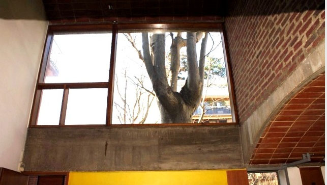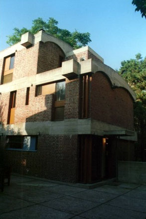 その驚くべき大きさは彫刻のような存在感を与え、外装に使われている珍しい素材、無塗装のコンクリート打ちっぱなしと素朴なレンガは、意図的にラフな外観を与えている。 工業的なオープン・ジョイントのレンガ造りのファサードには、大小さまざまな窓があり、コンクリートの帯が水平に交差している。