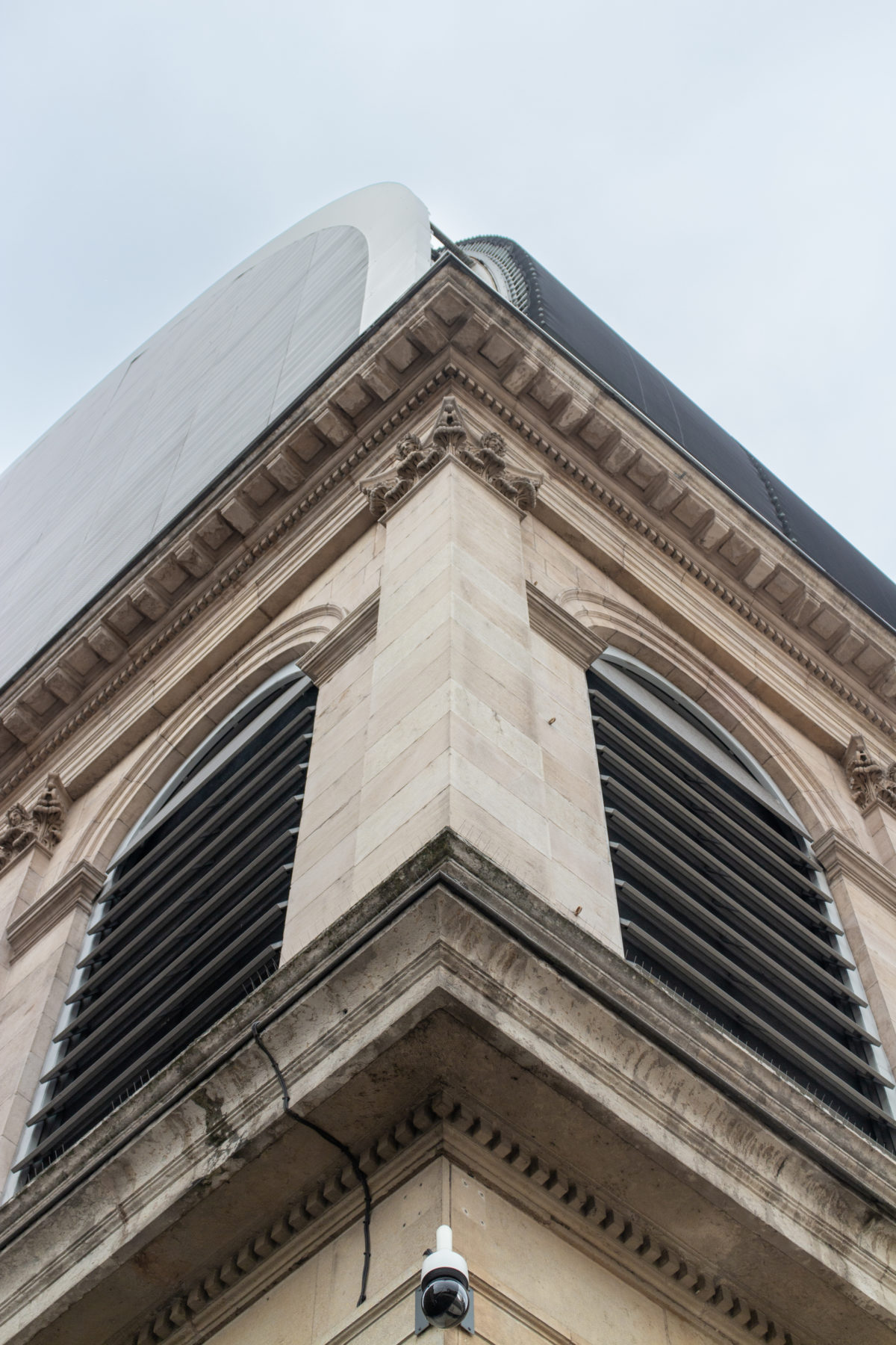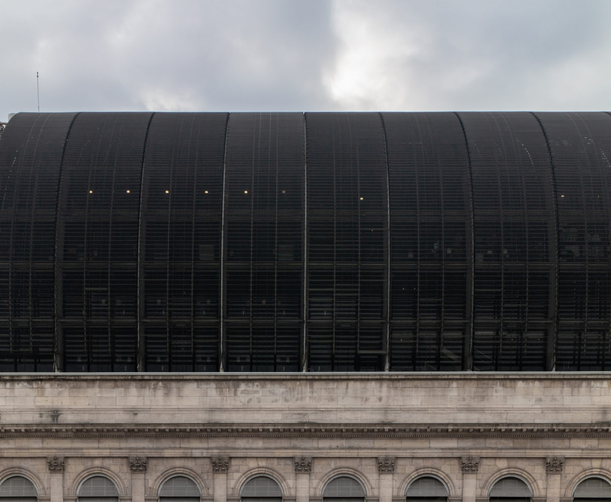 地上から7階建てで、バレエ団、ボックス席、管理部門のスペースが巨大な円筒形の胴体の下に集められ、古い鉄とガラスのコーニスの上にそびえ立ち、その表面の質感は大きなベネチアンブラインドのような何百もの金属製のルーバーで飾られる。