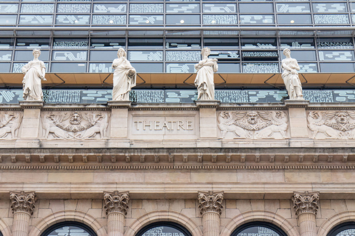 コメディー広場の反対側の端にある西側のティンパナムは、横格子状のルーバーと光の通路で覆われたガラスの広がりで、背後から照らされた空が見える。
