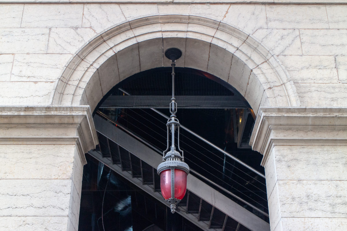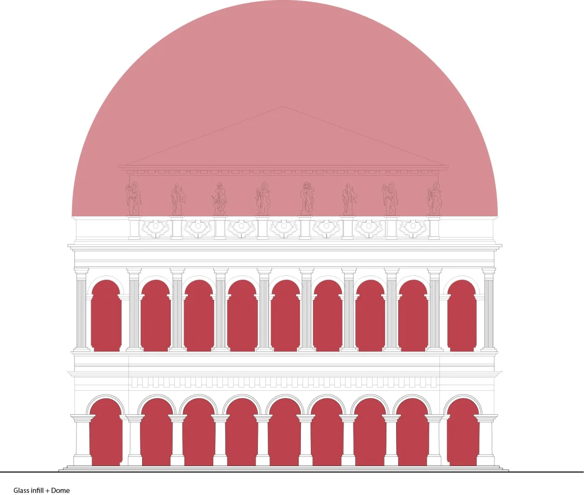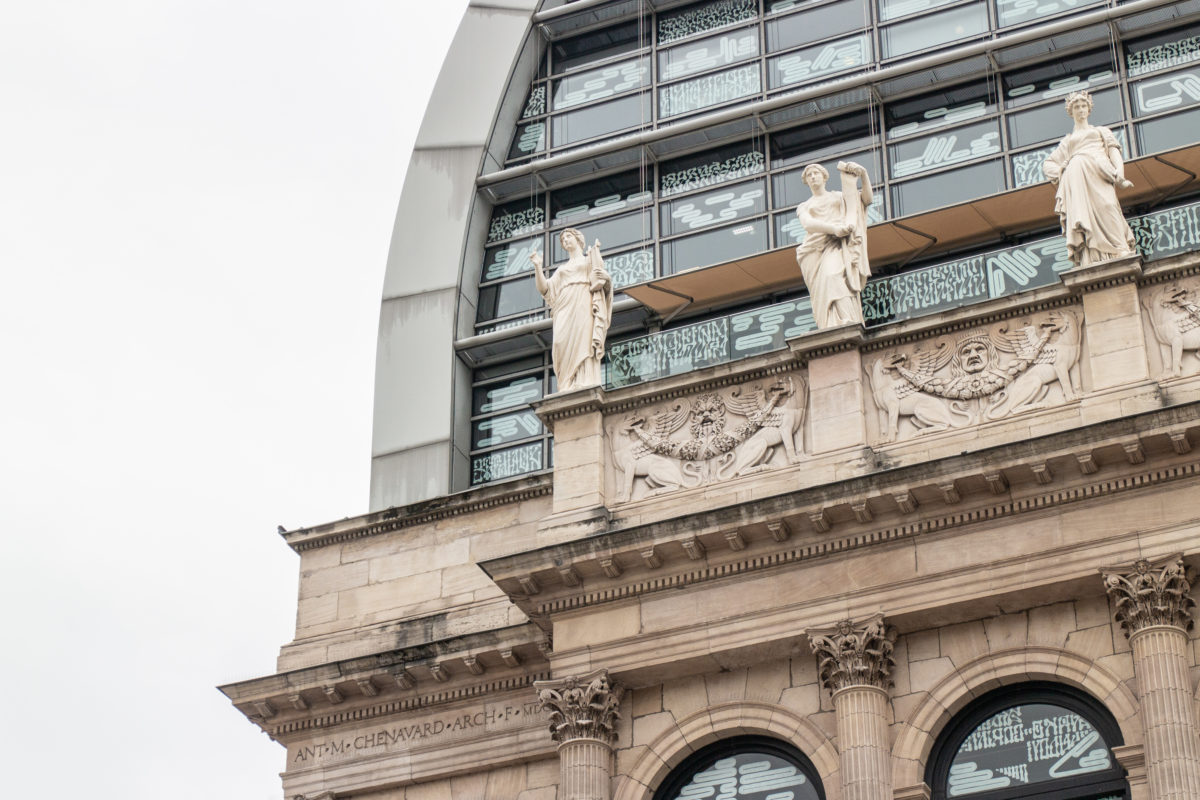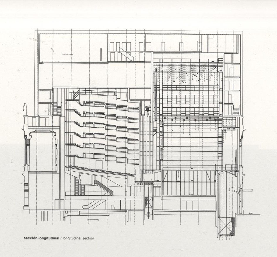 ヴォールトの主構造は、ライトグレーに塗られた半円アーチで構成され、既存のファサードのアーケードは保存されている。 底部にはドーム型ガラスのインナースキンがあり、外側はスクリーン印刷された格子ガラスの層で覆われている。 スクリーン印刷されたパターンの遊びは、太陽の入射角の強度が変化するにつれて、非物質化効果をもたらす。 そのシンプルさは、樽型吹き抜けを形成するガラスルーバーの均質な処理に由来する。