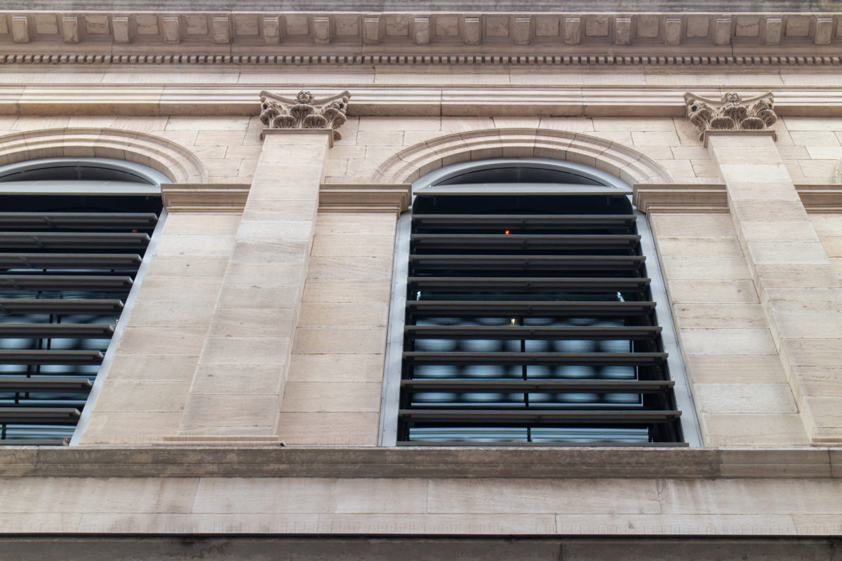 プラデル通りとセルリン通りのファサードの既存のベイは、メタリックグレーのパンチングスチールのスラットで隠されている。