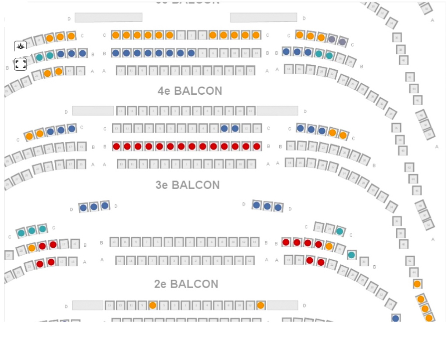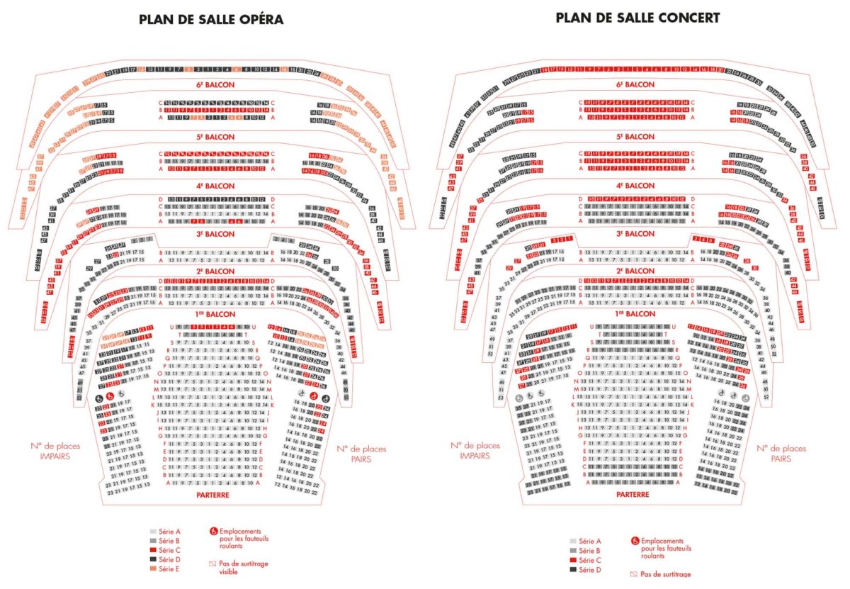 グランド・サルは、5階建て1,100席のイタリア式ホールで、金属製の梁で吊り下げられ、黒を基調とした現代的なホールで、オペラだけでなく、会議、演劇、大規模なコンサートにも適している。 正面のレイアウトは、6つの同じバルコニーを重ね合わせることで、舞台を完全に民主的に見渡すことができる。 音響コンサートは、このホールで理想的な空間を見つけることができる。このホールは、地下の振動や外部の交通騒音から隔離されており、吊り下げられたカーボンのシェルに収められているからだ。