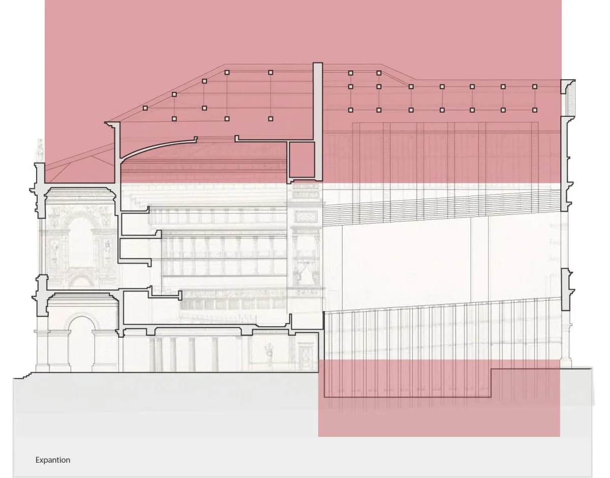 オペラハウスの新しいデザインでは、古典的な外観は維持され、素材は明確だが形は変わらない現代的な介入がなされている。 800席のメインホールを拡張する必要性も考慮され、改修によってさらに300席が追加され、地面を深く掘ることで地下5階にも200席の小さなパフォーマンススペースとレストラン、その他のパブリックスペースが増設された。