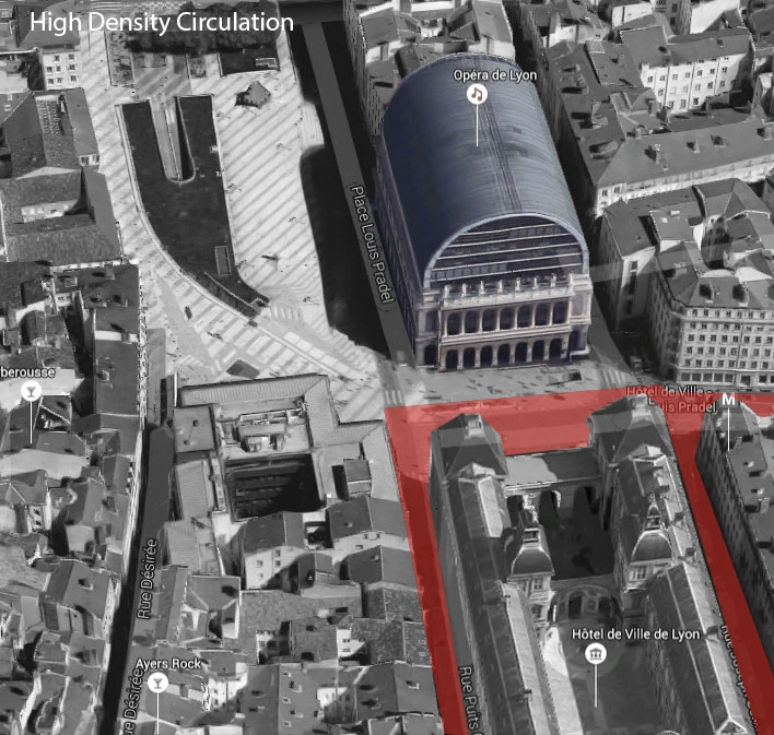フランス・リヨンのオペラ座は、コメディー広場3番地、リヨンで最も商業的な通りであるレピュブリック通りの始点という象徴的な場所に位置し、市庁舎地区を街の中心的な場所としている。