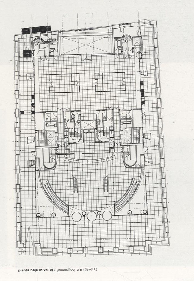 ファサードとファサードの間の空間には、金属製の階段が網の目のように張り巡らされ、市民の避難に使われている。 このシステムは、エンクロージャーのリズムとは無関係に、メイン・オーディトリアムの高さから降りてくる。