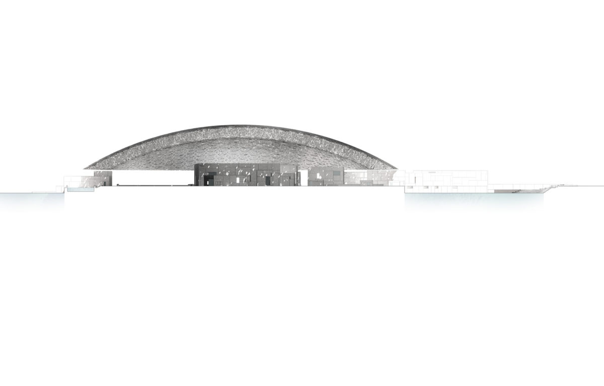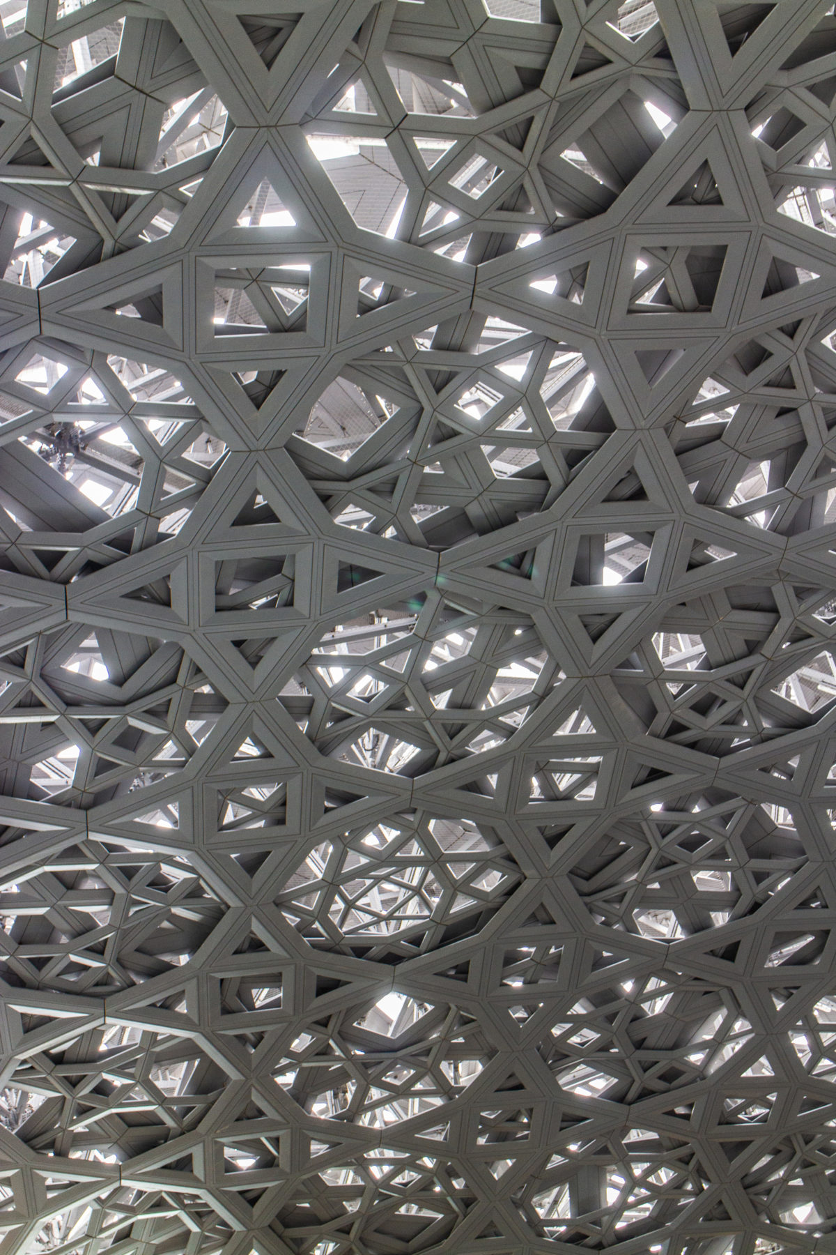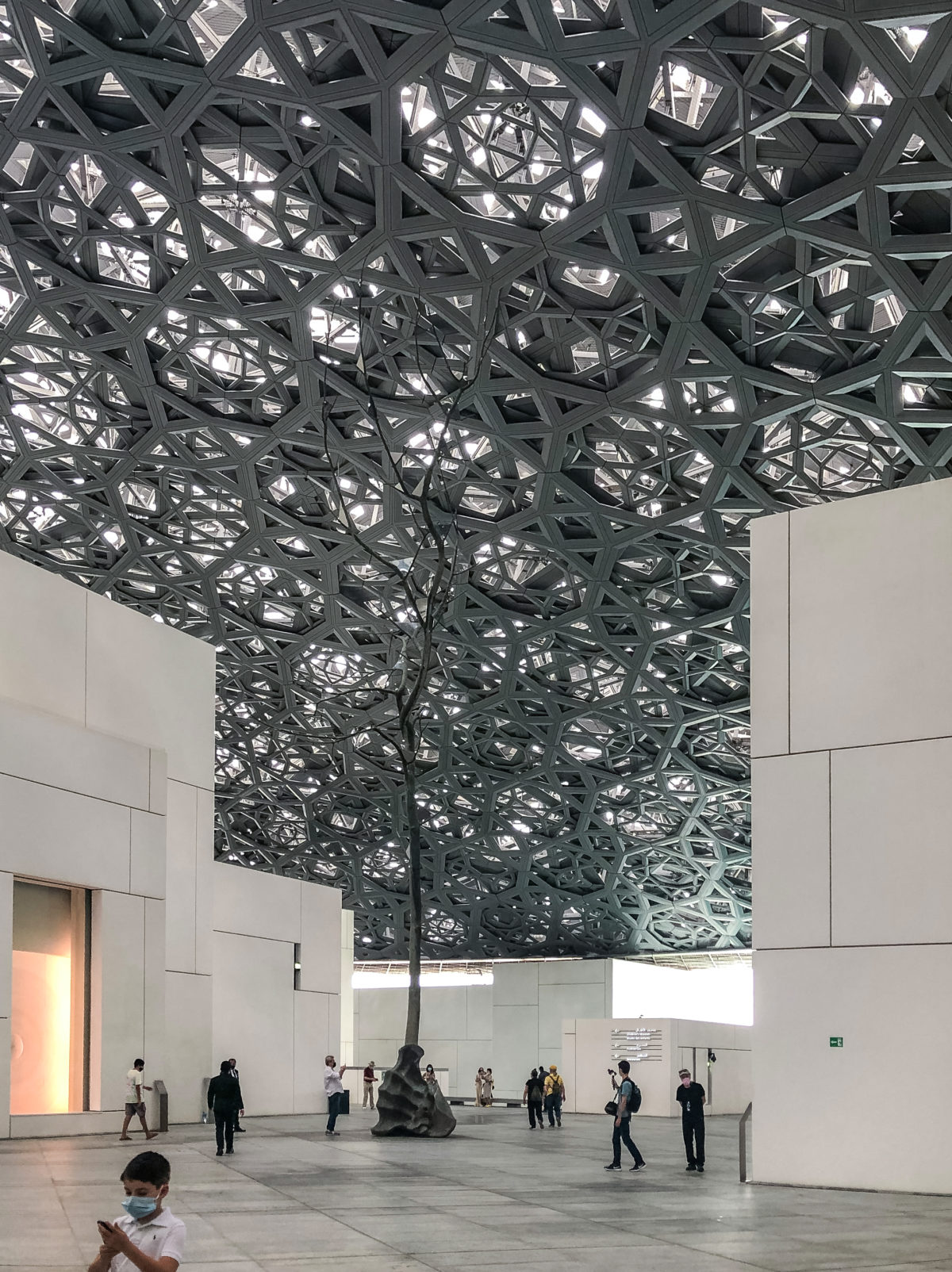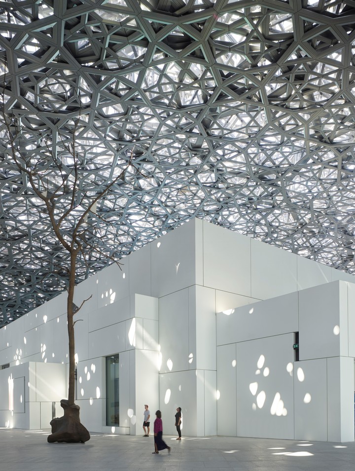 「アラブ建築の重要なシンボルであるドームをベースにしたプロジェクトです。しかしここでは、伝統からの明らかな逸脱によって、ドームは現代的な提案となっている……」とジャン・ヌーヴェルはコメントしている。 ランダムに穴のあいた織り目で作られており、陽光が差し込むと影ができるようになっています」と建築家は説明する。 この自然への賛辞は、アブダビのヤシの木からインスピレーションを得ている。 その葉は、上からの明るい日差しを濾過して和らげ、地面に斑点模様を投げかけている。
