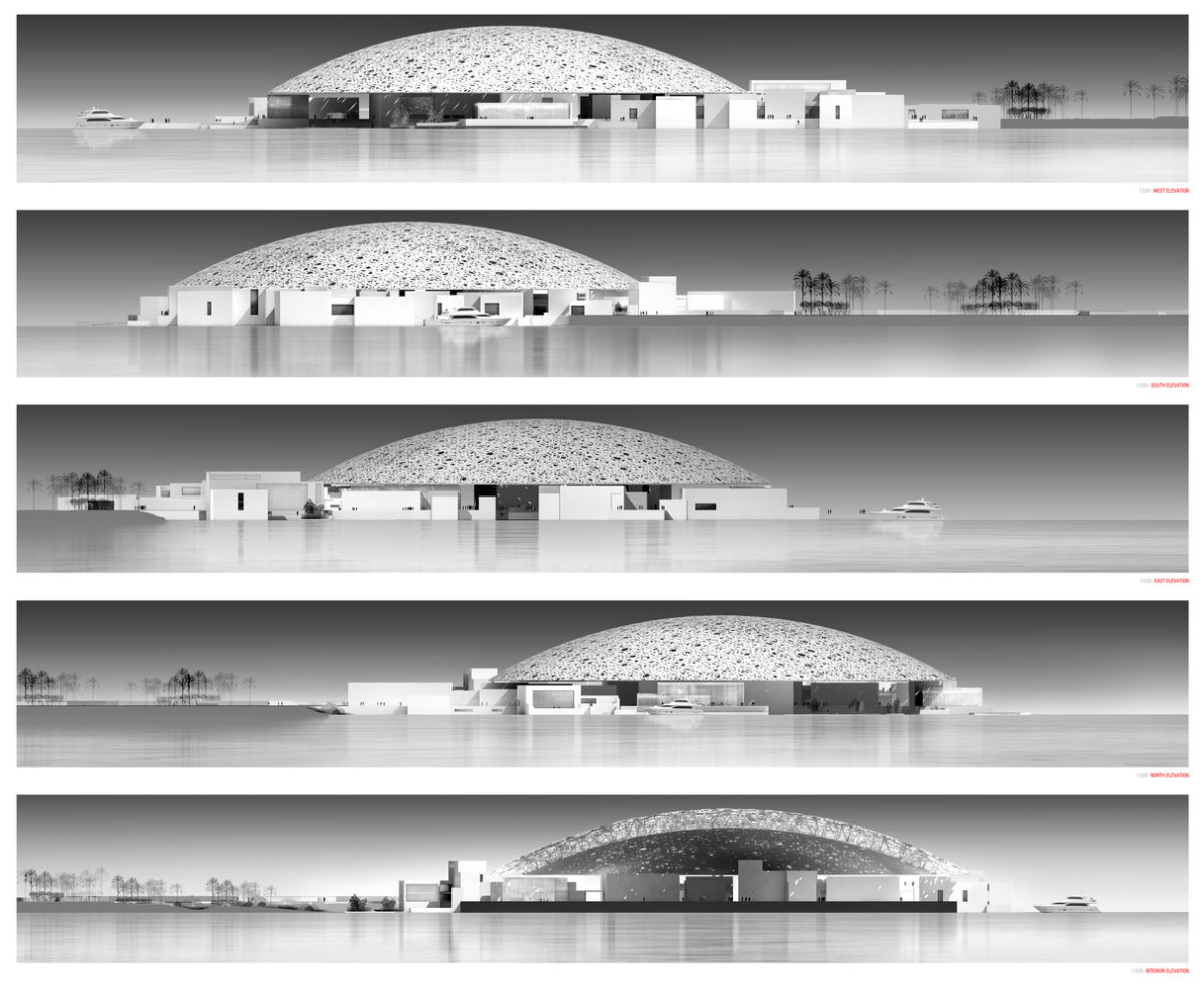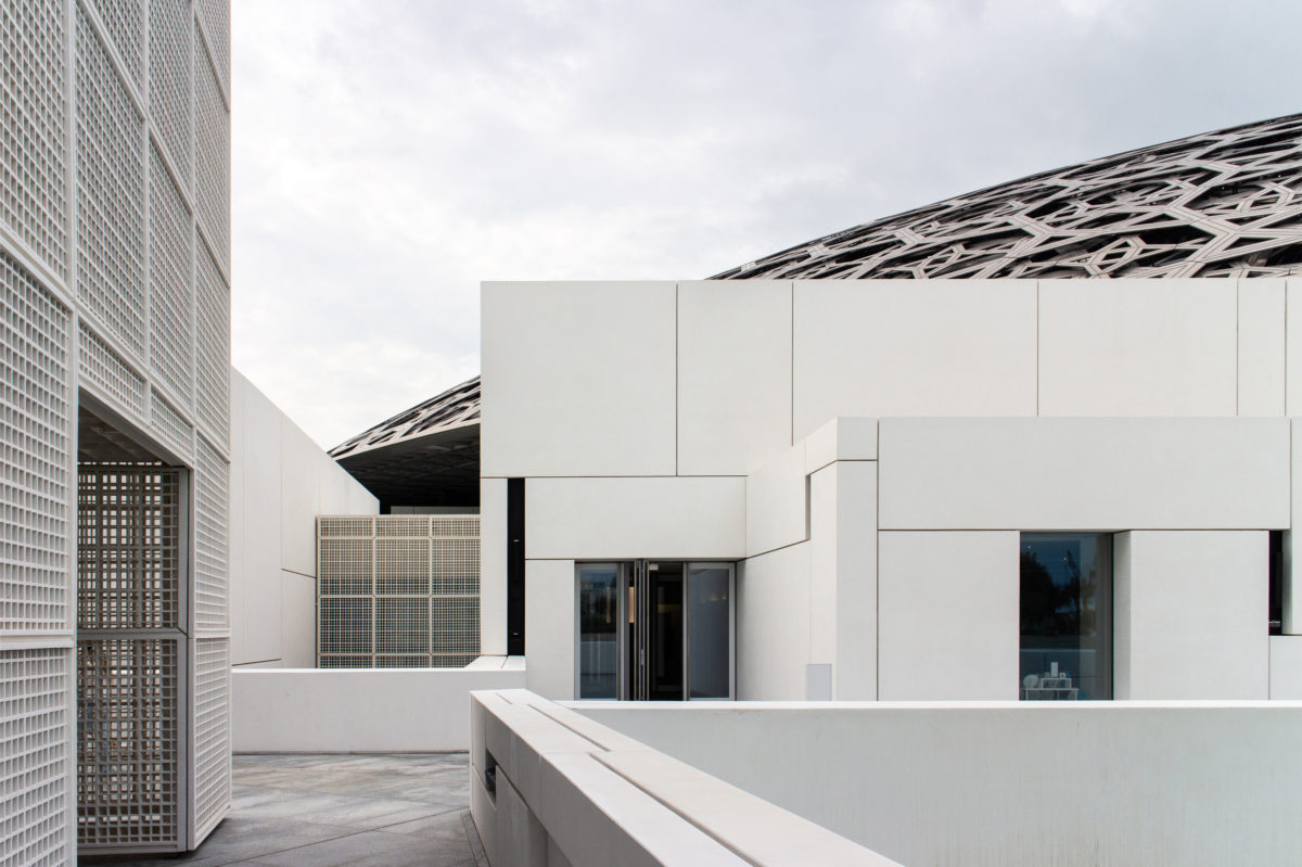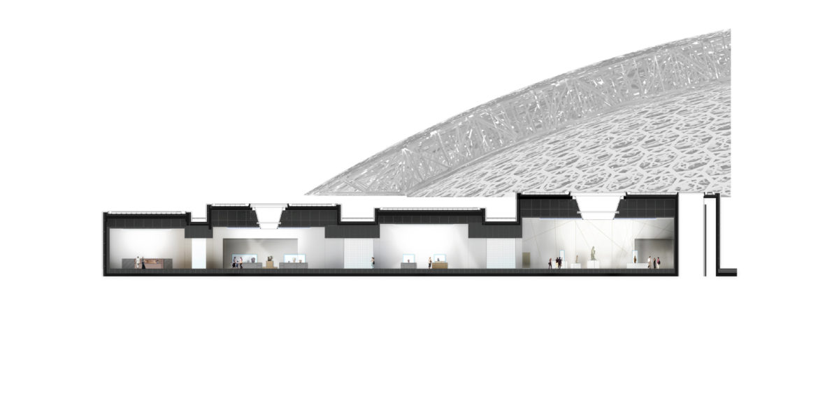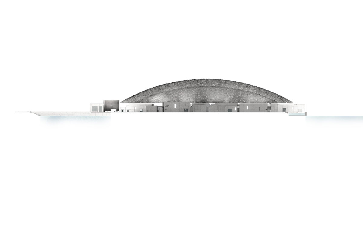 「アラブ建築の重要なシンボルであるドームをベースにしたプロジェクトです。しかしここでは、伝統からの明らかな逸脱によって、ドームは現代的な提案となっている……」とジャン・ヌーヴェルはコメントしている。 ランダムに穴のあいた織り目で作られており、陽光が差し込むと影ができるようになっています」と建築家は説明する。 この自然への賛辞は、アブダビのヤシの木からインスピレーションを得ている。 その葉は、上からの明るい日差しを濾過して和らげ、地面に斑点模様を投げかけている。