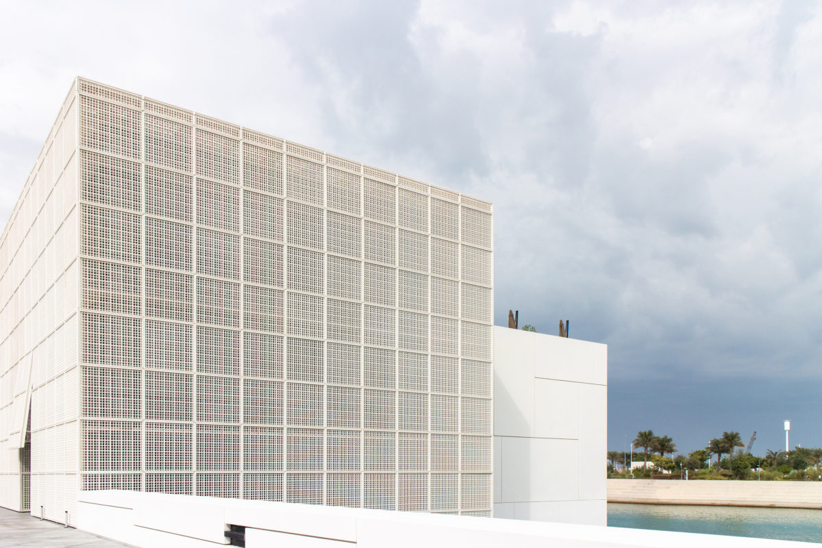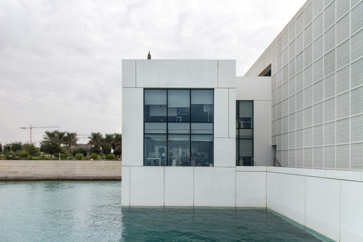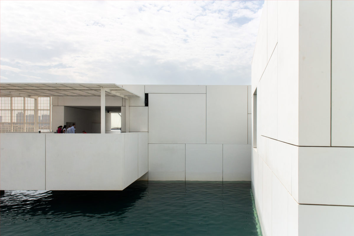 コンクリート、水、そして反射する光の微妙な戯れのシンフォニーであるこの設計は、この地域の豊かな建築の伝統と、アラビアの空とサディヤット島の砂浜とペルシャ湾の海が出会う地点という美術館のユニークな立地からインスピレーションを得ている。