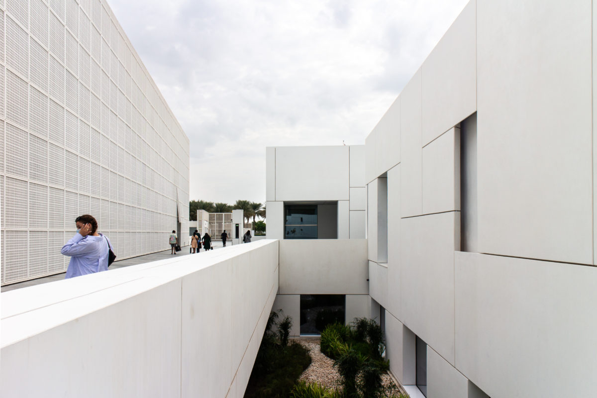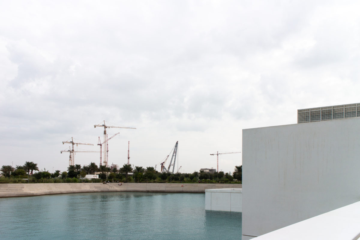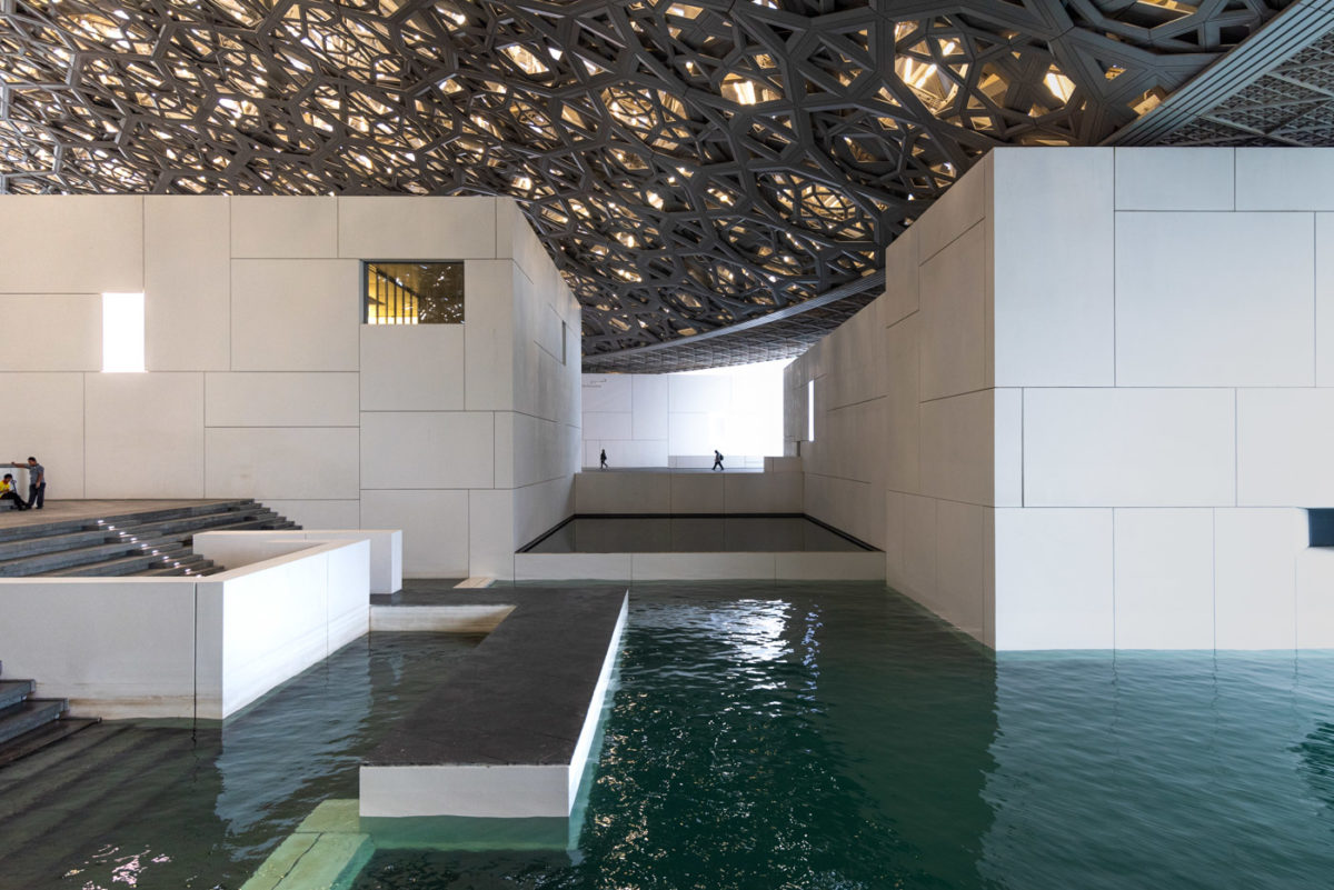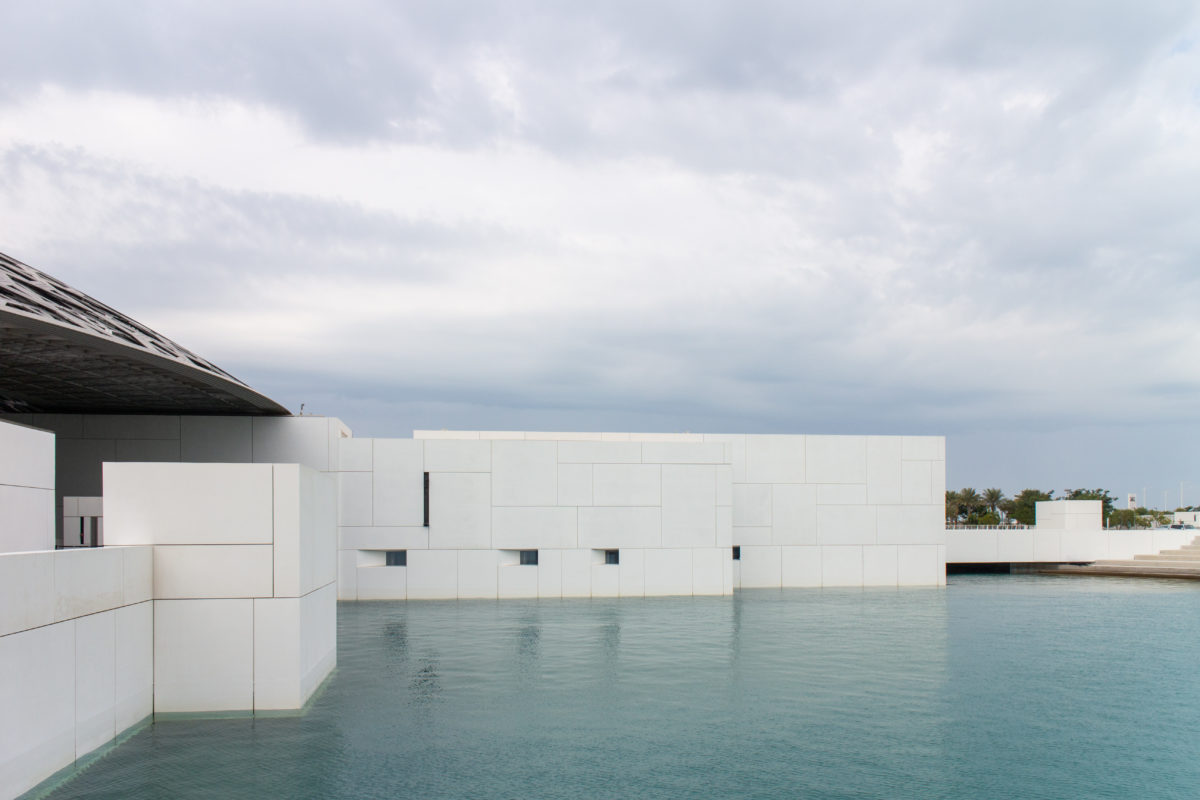 コンクリート、水、そして反射する光の微妙な戯れのシンフォニーであるこの設計は、この地域の豊かな建築の伝統と、アラビアの空とサディヤット島の砂浜とペルシャ湾の海が出会う地点という美術館のユニークな立地からインスピレーションを得ている。