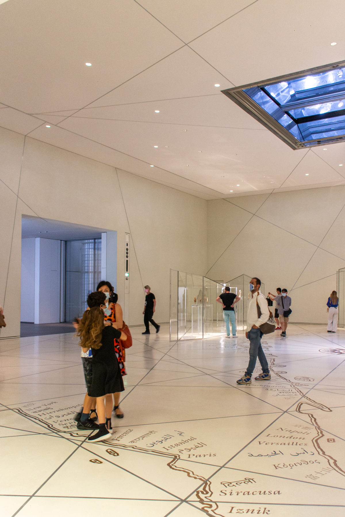 これらの半屋外スペースは、特別に依頼されたインスタレーションを展示するために使われ、美術館の常設コレクションと企画展は、白い立方体のブロックの中に収められ、「ミュージアム・シティ」を作り出している。 ルーヴル・アブダビには、常設展示室23室(6400m2)、企画展示室、子供博物館(200m2)を含む8600m2の展示スペースに加え、250席のオーディトリアム(420m2)、レストラン、ショップ、カフェがある。