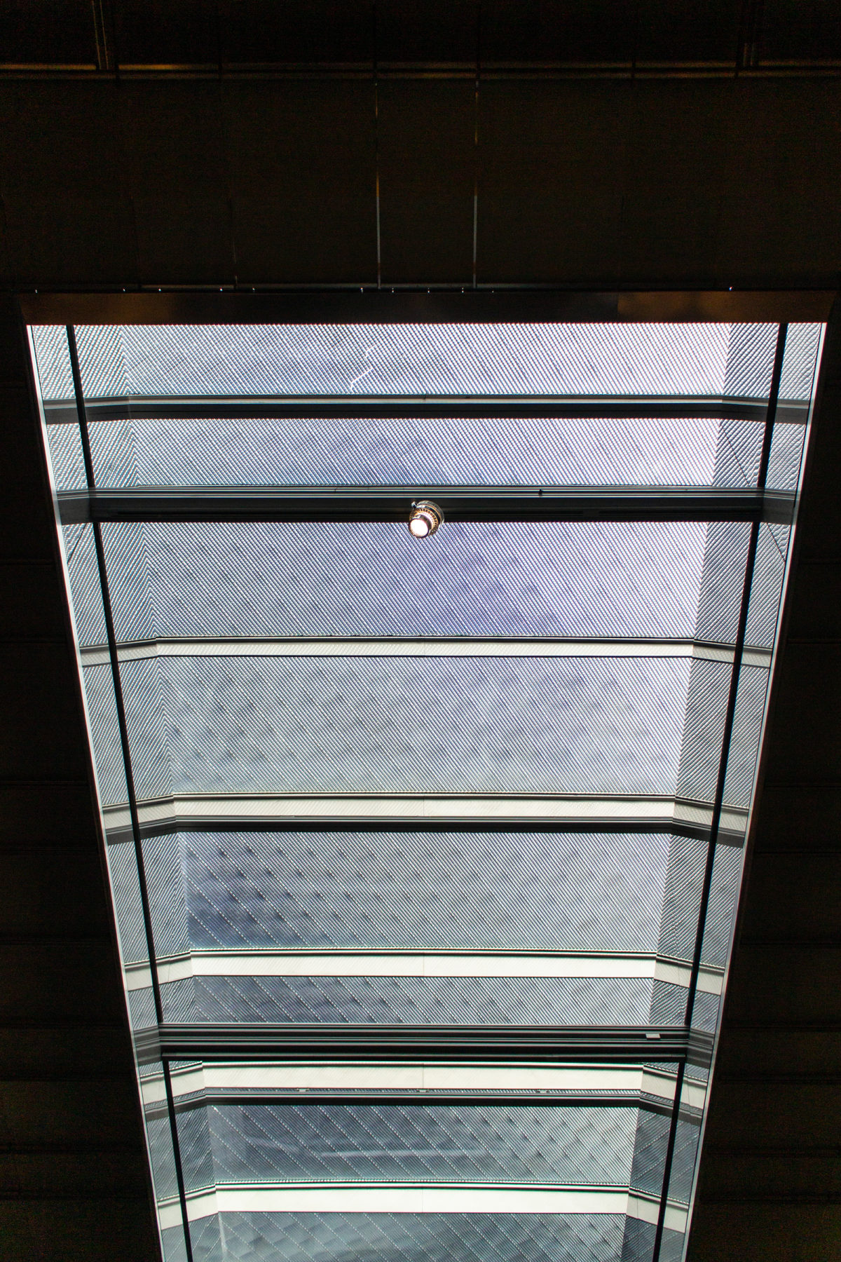 55のホールを覆うドームは、8層のパンチングメタルでできている。 外層4層ステンレス、内層4層アルミニウム。