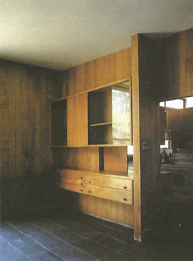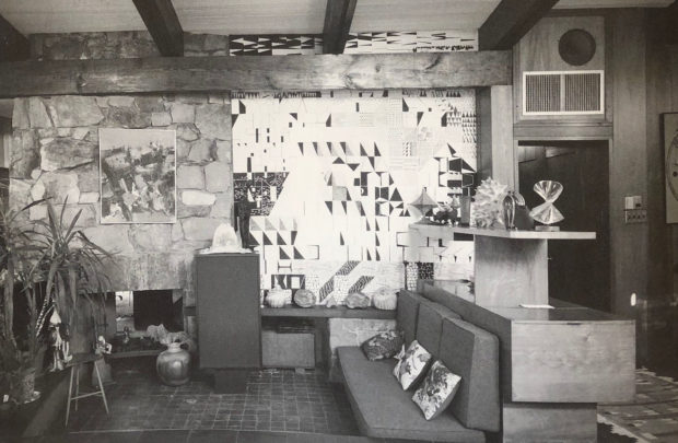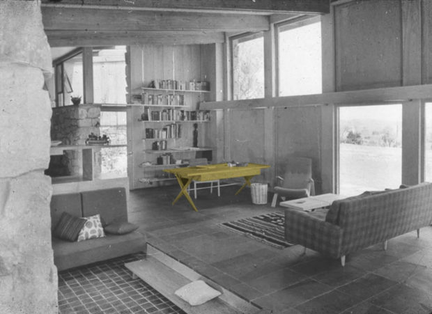 中央の長方形のプランエリアは、ベッドルーム棟とリビングルーム棟をつなぎ、昼間の活動と夜間の活動を分離する「二核」計画の原則に従っている。 サービス、回遊、その他の具体的な機能があり、大きな暖炉は原石で造られ、屋外の大きな石造りの暖炉に対応する低層の腰掛けエリアがある。 ルイス・カーンと アン・ティンがデザインした家具は、イームズ、サーリネン、ジョージ・ネルソンの作品も使用されている。