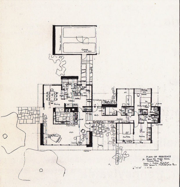その中でも、ワイス・ハウスは、当時の典型的な小さな部屋にもかかわらず、その時々の関連性から逃れた品質を表現する、非常に複雑なプロジェクトである。 この住宅は、敷地と計画に対応し、構造を表現し、カーンの職人技と素材への関心を反映している。