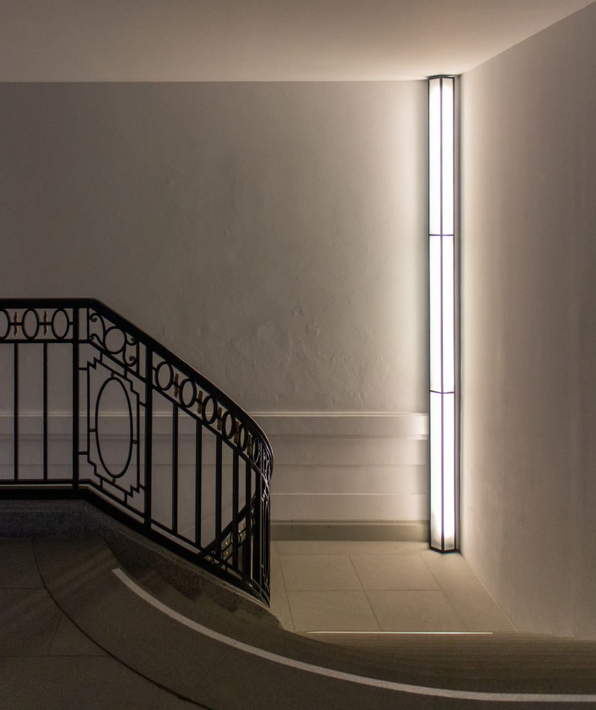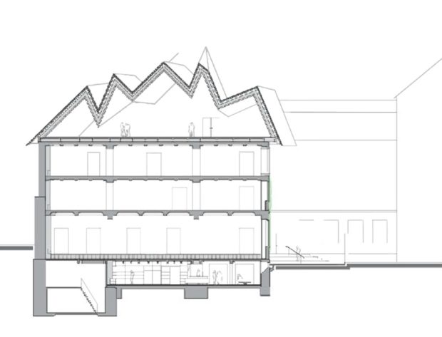 階段室とホールが建物の高さにある本館は、柱のない突出した上階を加えて増築された。 既存の床の上に建てられた650m2の新しい自立式ロフトは、外壁の上に設置され、外壁は支持面として機能する。