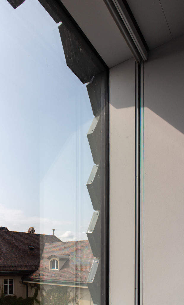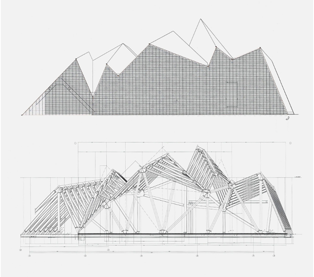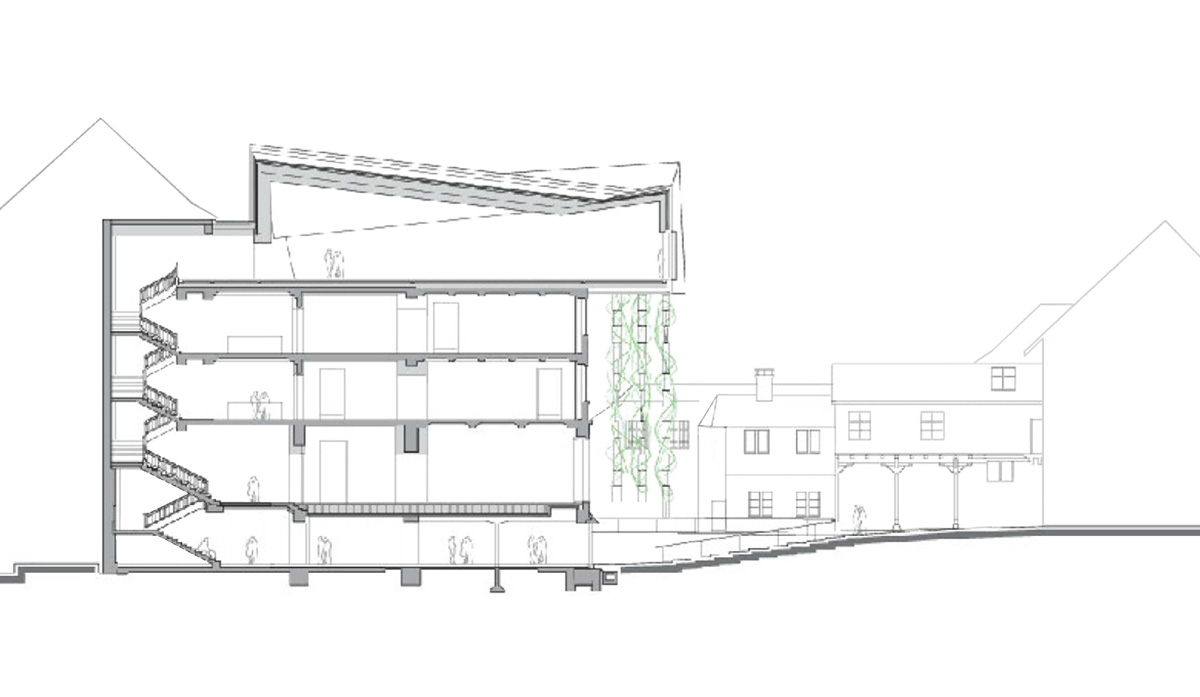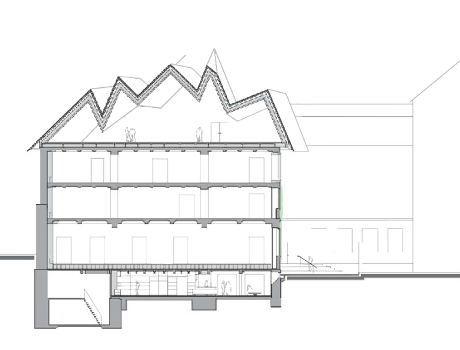 屋根の折れ曲がりが不揃いであるにもかかわらず、近隣の歴史的建造物の景観と同じようなスケールを持つように、アーティキュレーションが施されている。