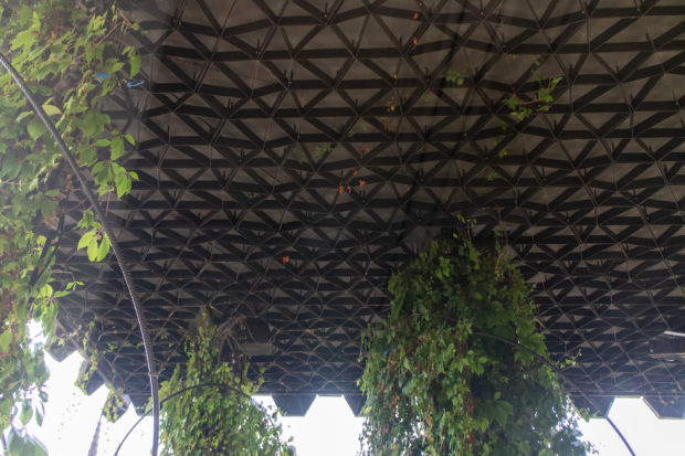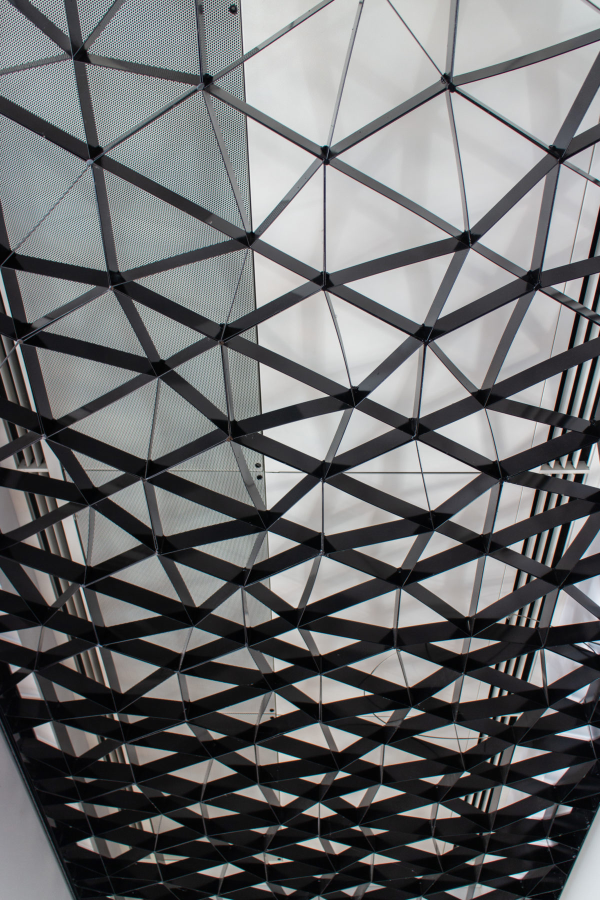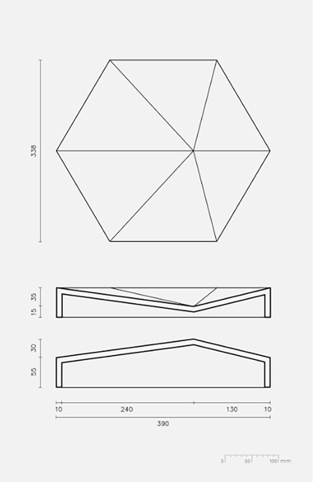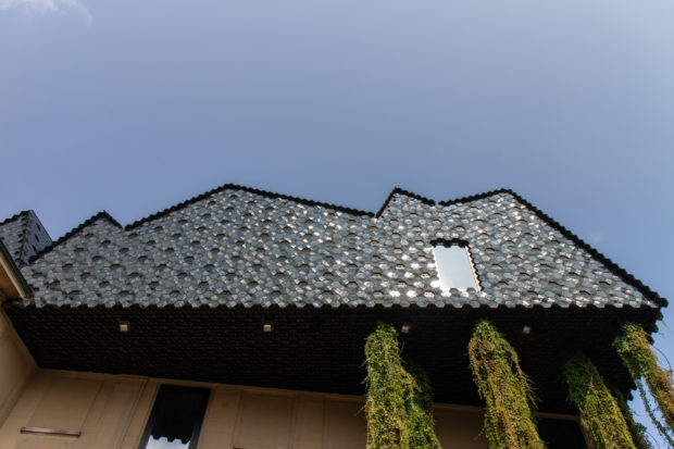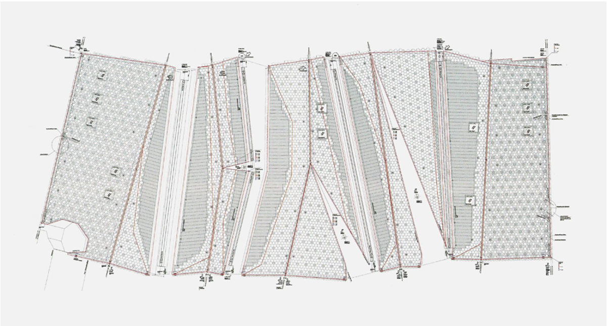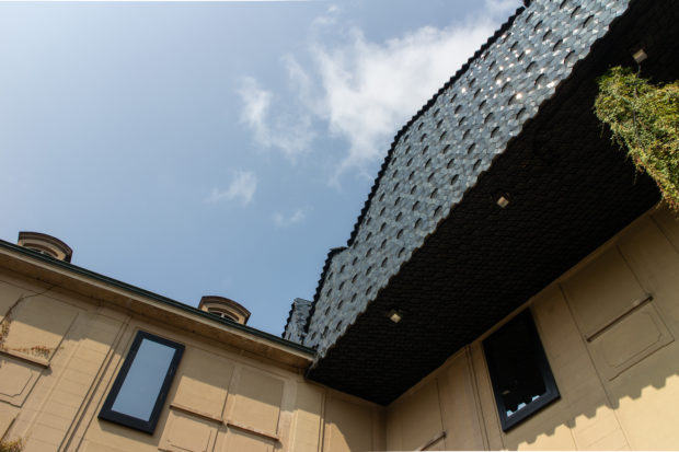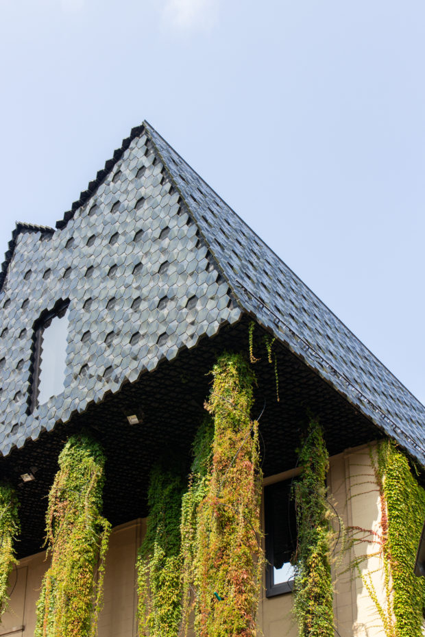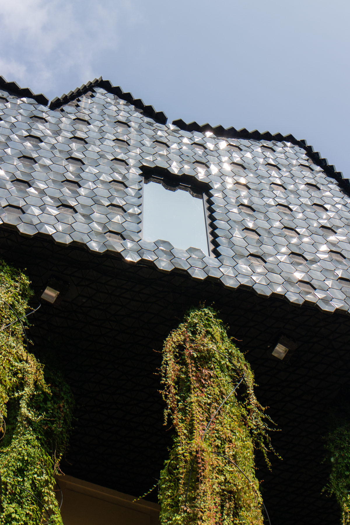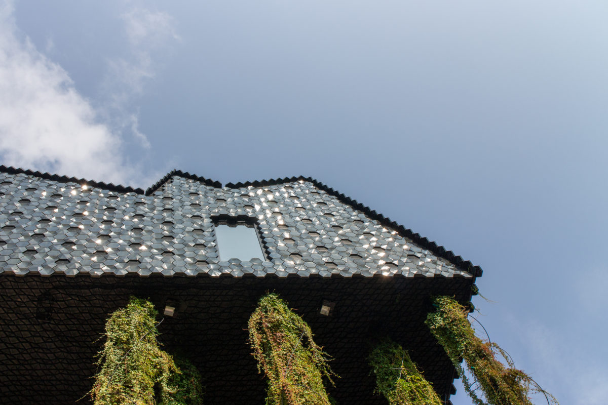 山脈の形に折りたたまれた屋根は、このプロジェクトのために特別に開発された1万枚の釉薬のかかった立体的な六角形のセラミック・タイルで覆われている。 その特異な形状のため、また光の入射、時間帯、見る角度によって、緑色と明るさや色相が交互に変化し、絶えず変化する視覚的外観を作り出す。