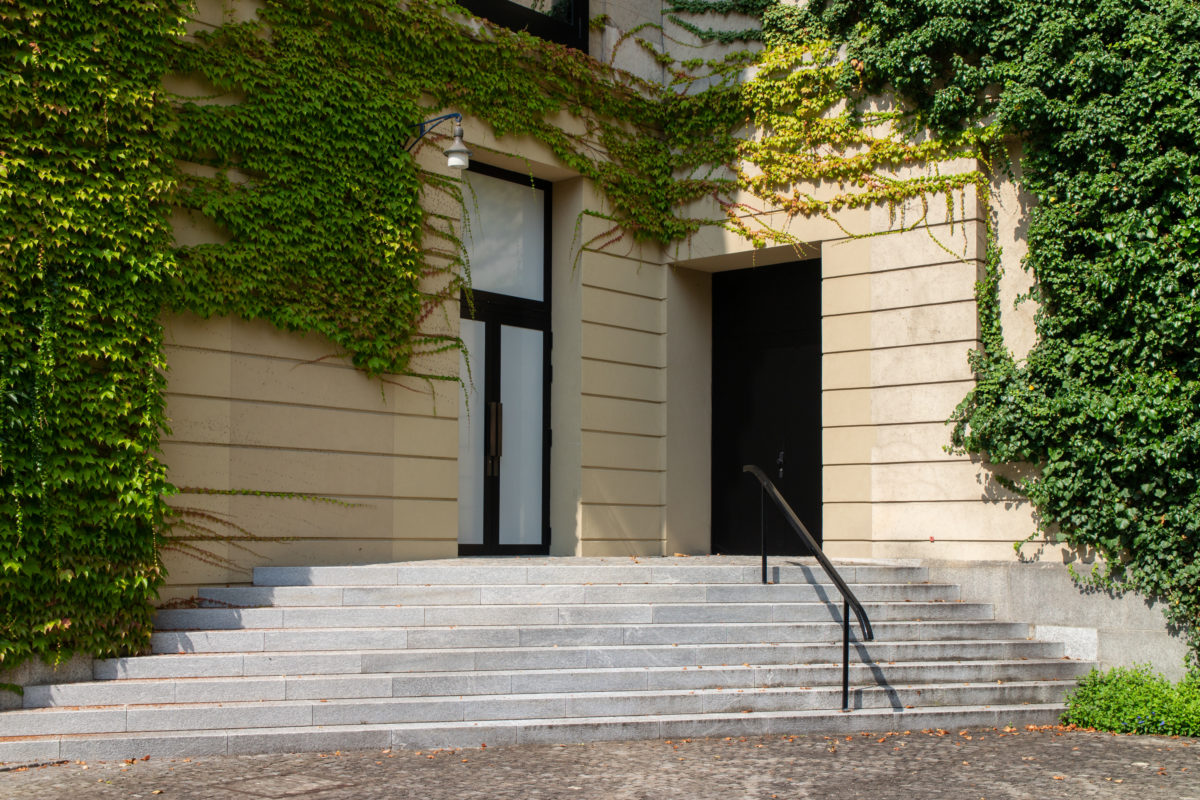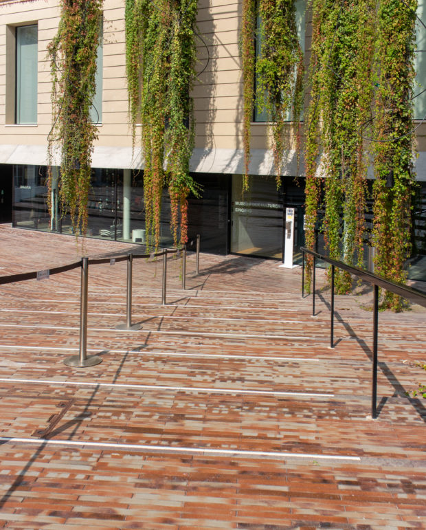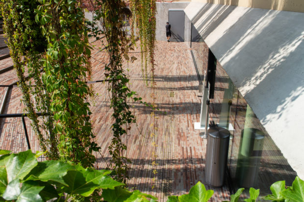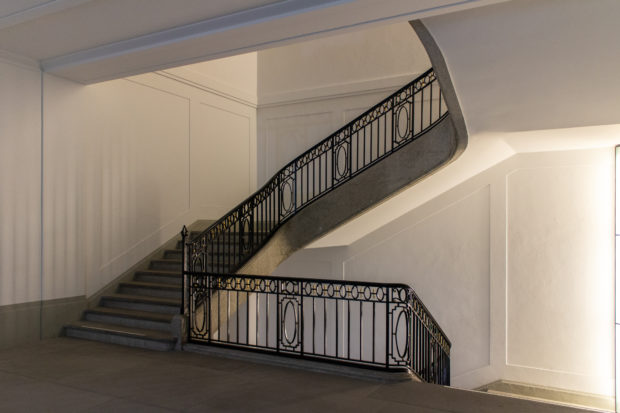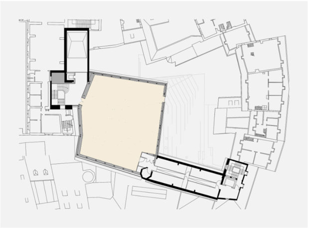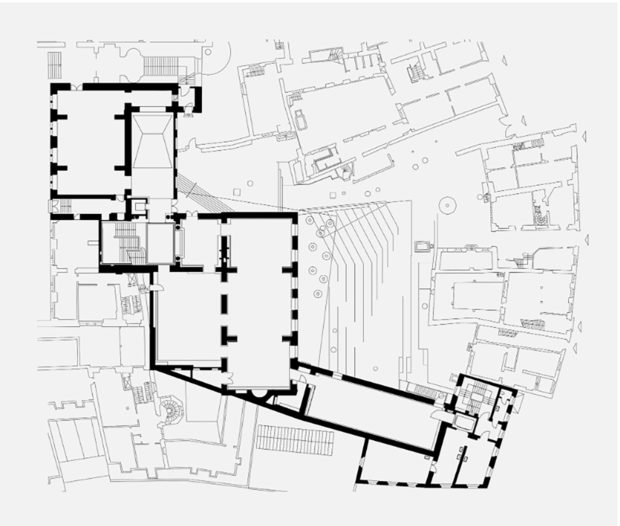 エントランスホールを作るために、かつての地下室は中庭に開放され、中庭は再び円形劇場の形に段差が付けられ、美術館のために拡張された。 ファサード全体をガラスで囲み、内部と外部の視覚的な関係を作り出している。