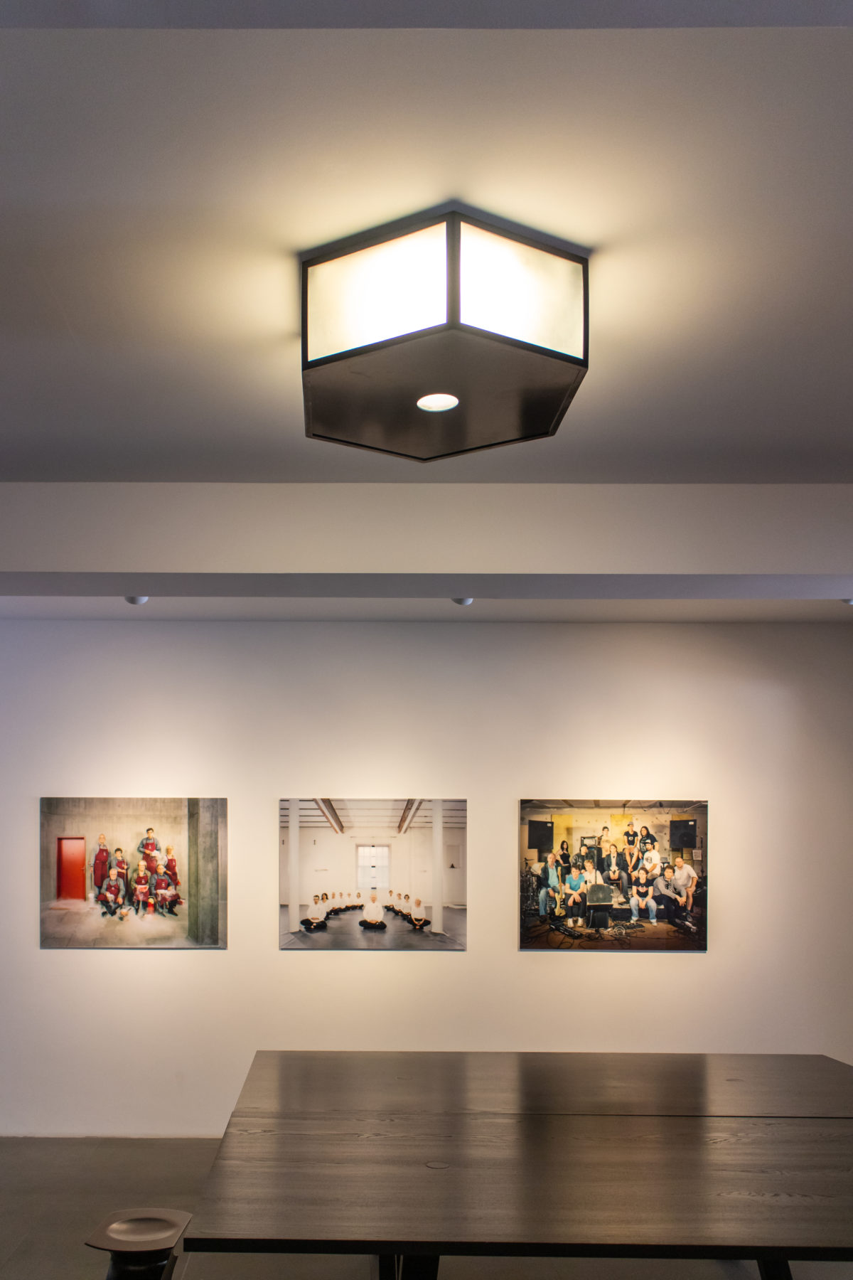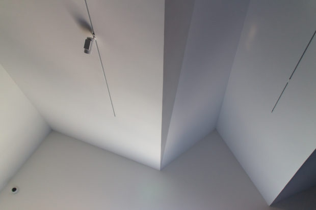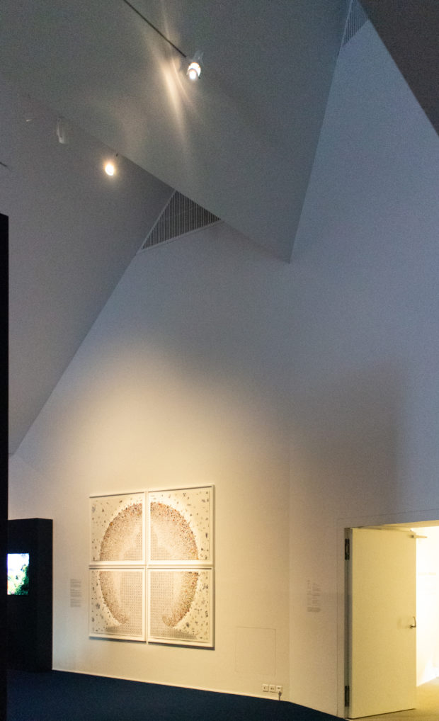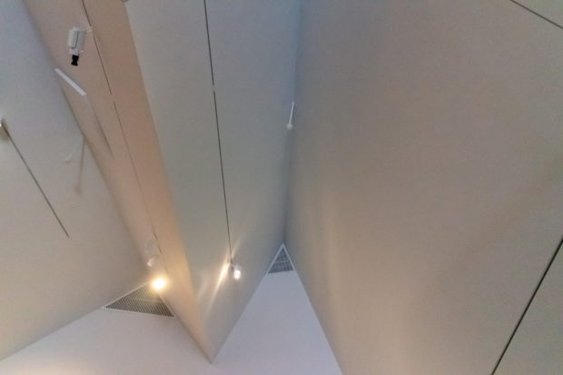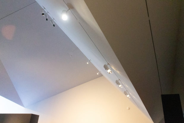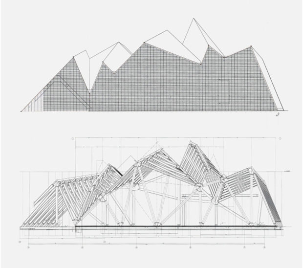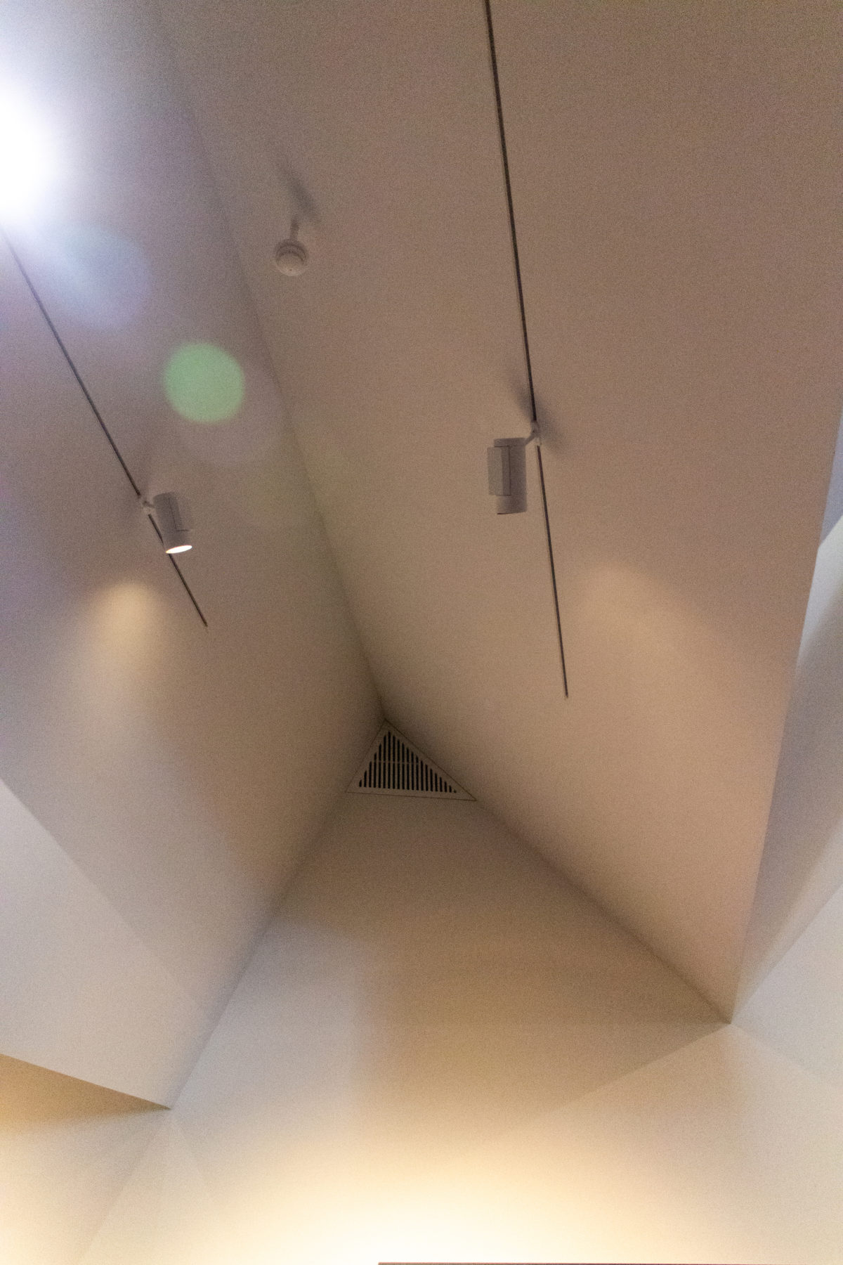 折れ屋根の鉄骨フレームにより、下には柱のないギャラリーが設けられ、650m2の表情豊かな空間は、低層階の静かな直角のギャラリーと印象的なコントラストを成している。 上階の幾何学的な形状は、不規則な稜線を持つのこぎり歯の屋根のようだが、実際は柱のない軽やかな空間の骨組みである。 表情豊かな空間は、低層階の静かな長方形のギャラリーとは対照的だ。
