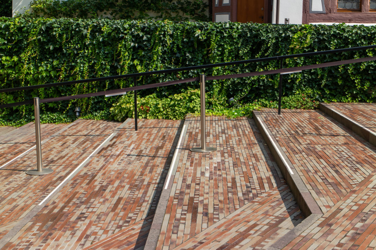 ミュンスター広場の舗装は、入場口へと続く階段の始点まで続いている。 階段はクリンカー煉瓦で覆われ、前面は赤いポーフィリーで覆われている。