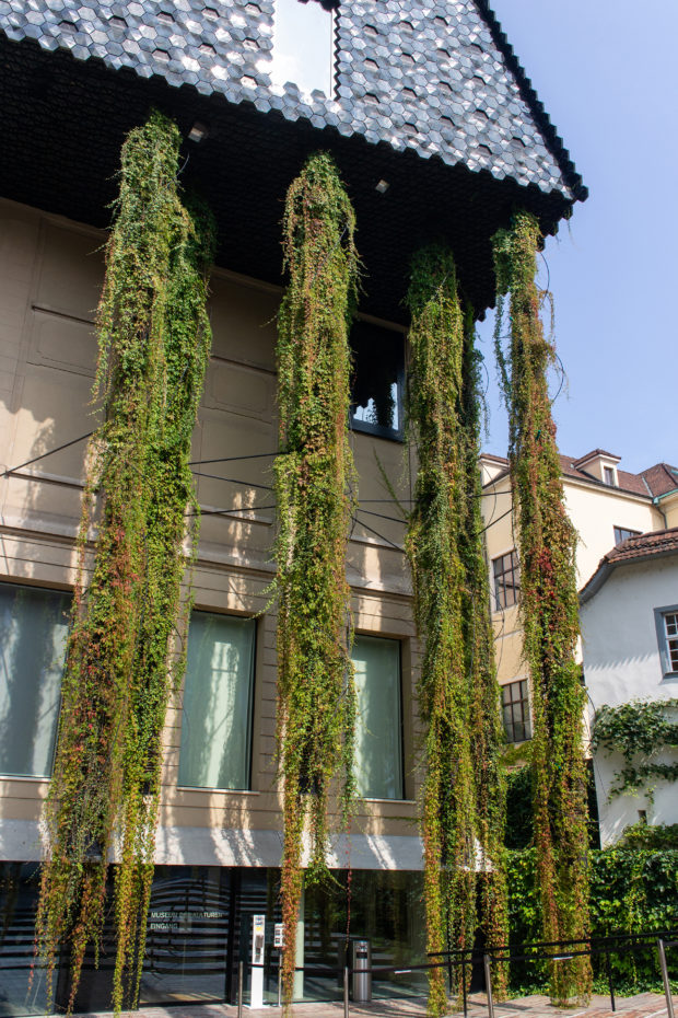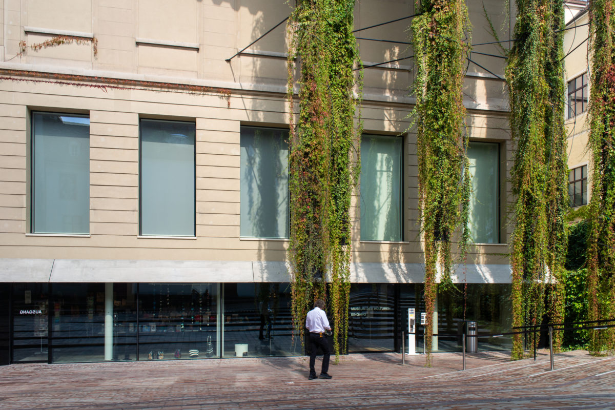 重々しく内向的な印象の建物は、当初はその中身を隠していたが、窓の多くが閉じられたファサードや、片持ち屋根の軒下に取り付けられた張り出した植生を支えるための螺旋状の構造によって、その印象を強めている。 しかし、建物の全長にわたって開放され、訪問者を歓迎する土台によって、これは相殺されている。 これらの建築的介入は、植生とともに、1917年に建てられた長く角ばった画一的なヴィシャーの建物を、異なるセクションに分割している。