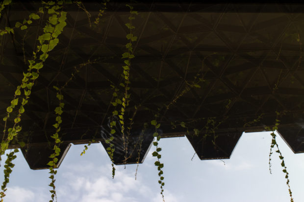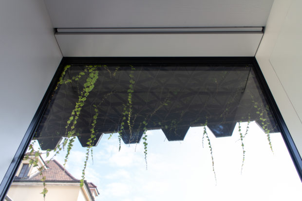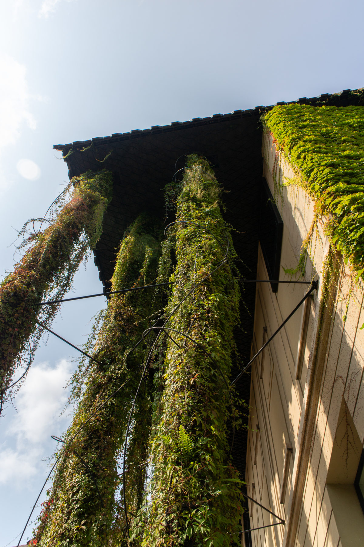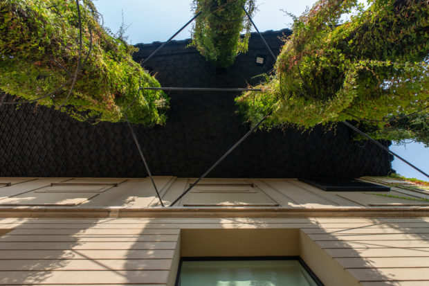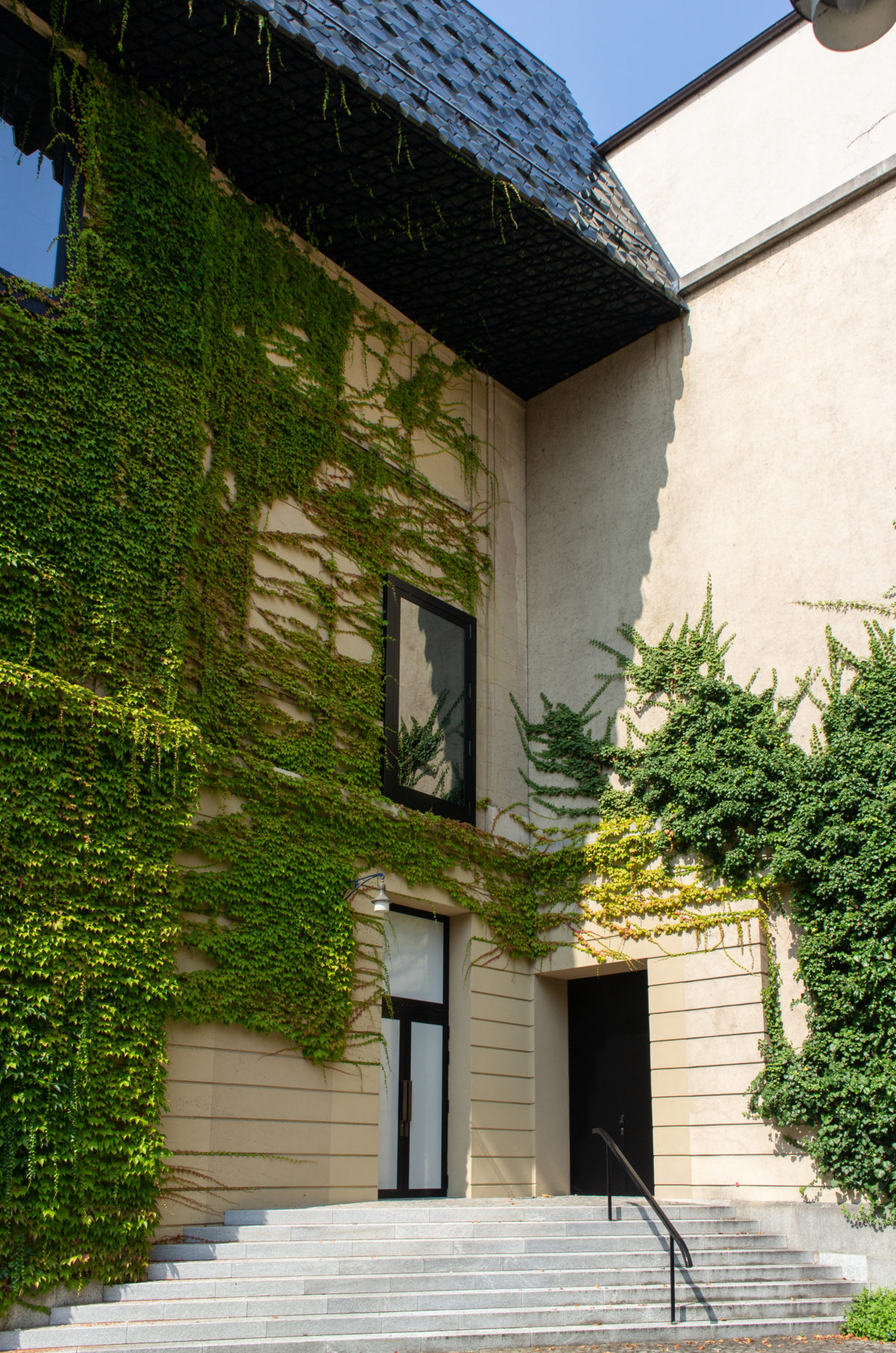 エントランスのファサードは、大きな張り出しを邪魔する空中庭園で飾られている。 残りのファサードはバージニア・クリーパーで覆われている。