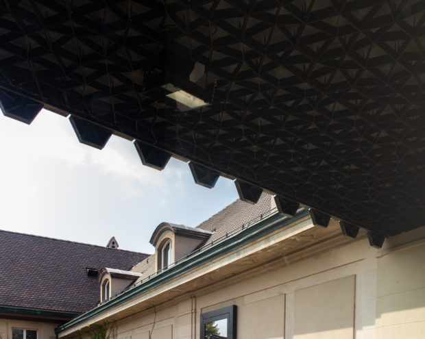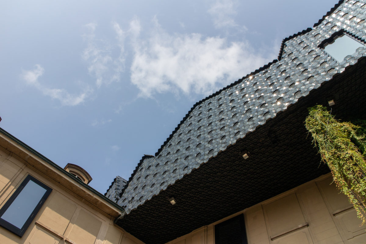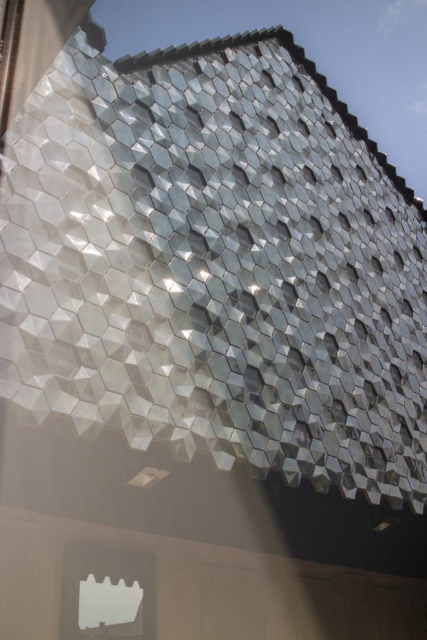 黒緑色のセラミック・タイルで覆われた不規則なひだによって形成された屋根は、中世の景観と共鳴すると同時に、近隣の中心部における再生の明確なサインとして機能している。 六角形のタイルの一部は立体的で、空が曇っていても光を屈折させ、旧市街の屋根の細かい構造のレンガタイルによく似た効果を生み出している。