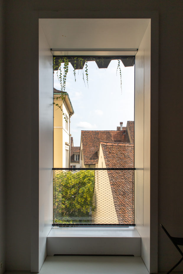 窓を閉め切ったのは、建物の重量感と優雅さを高めるためだけでなく、古い部屋のスペースを確保するためでもあった。 わずかに残った開口部は広げられ、今では地面まで伸びている。 旧市街を見下ろす小さなニッチを形成するほど奥行きのある窓からは、自然光が室内に降り注ぎ、心地よい開放感が伝わってくる。